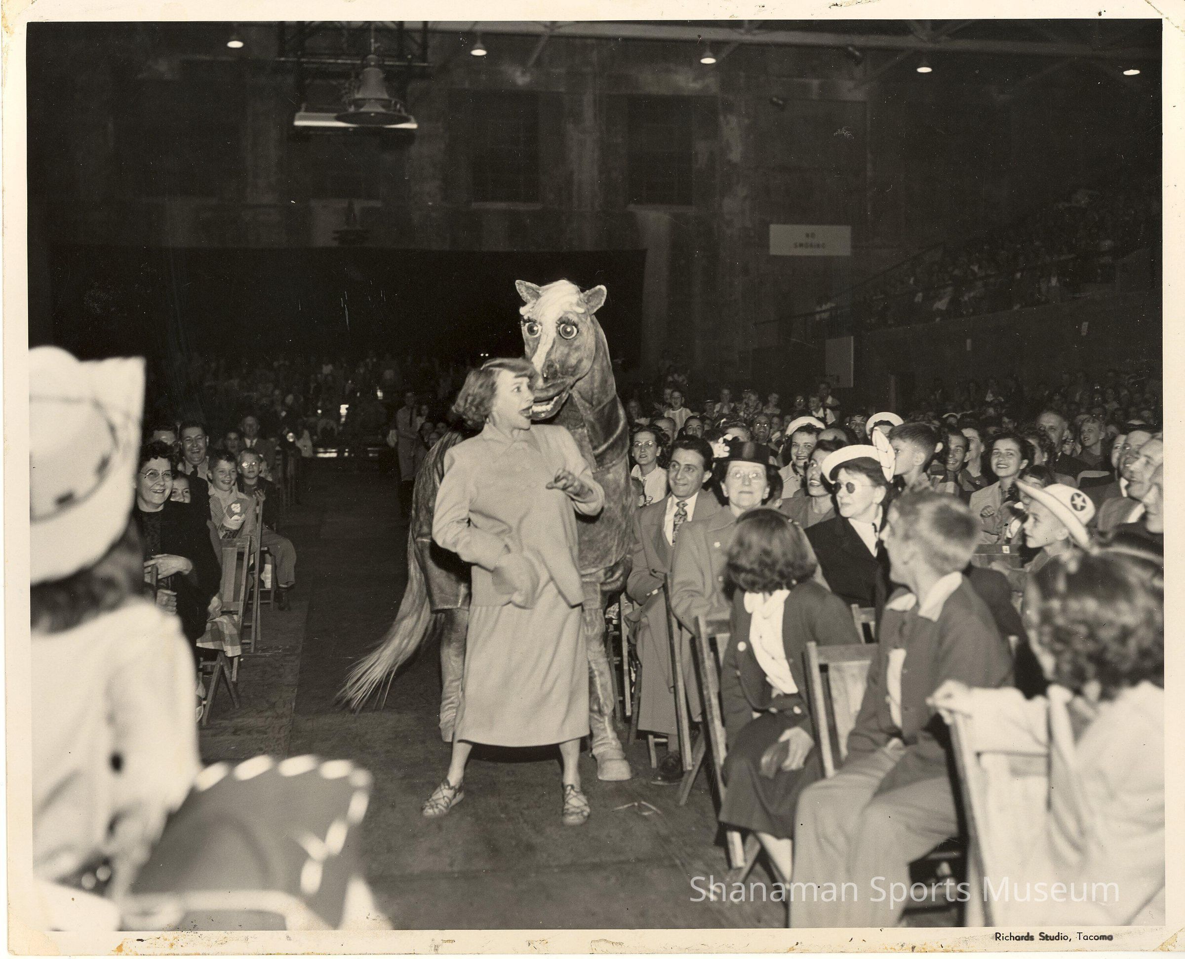 B/w photograph of TAC event with crowd seated and woman standing in the isle with people in a horse costume behind her.Relationships