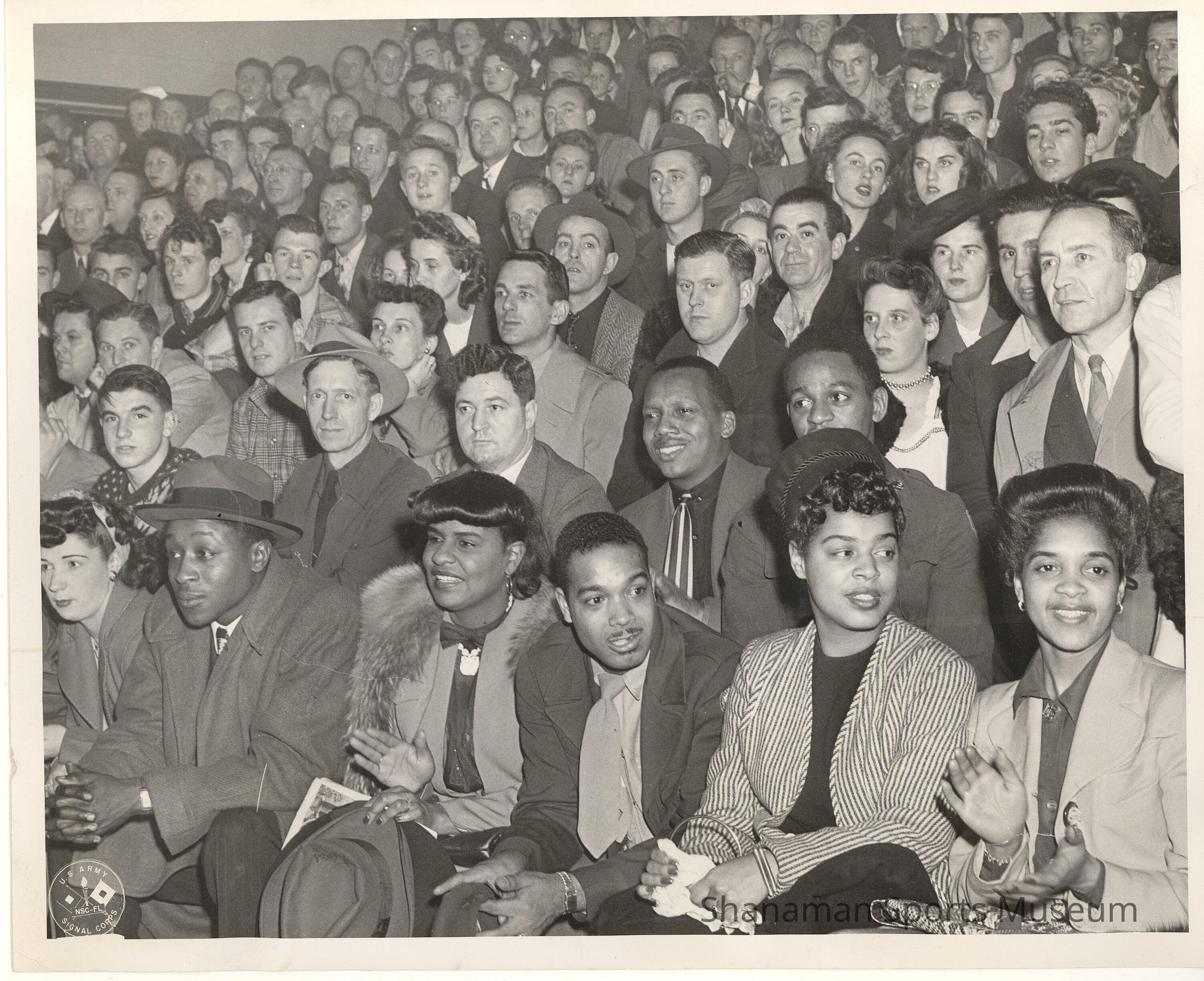 B/w photograph of a seated crowd in stands.Relationships