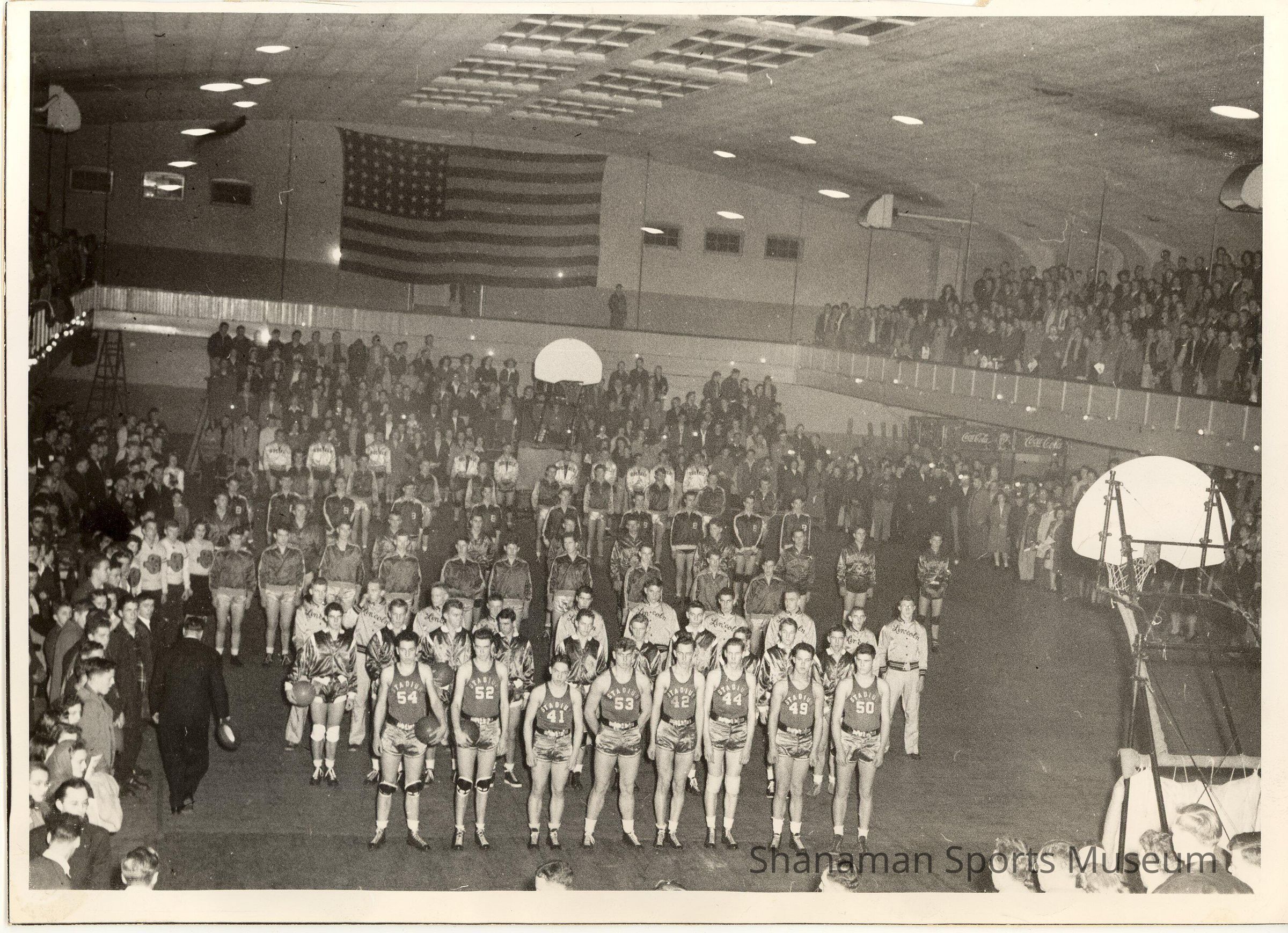 With a capacity crowd in the stands in the background, unidentified players for multiple basketball teams line up on the court.