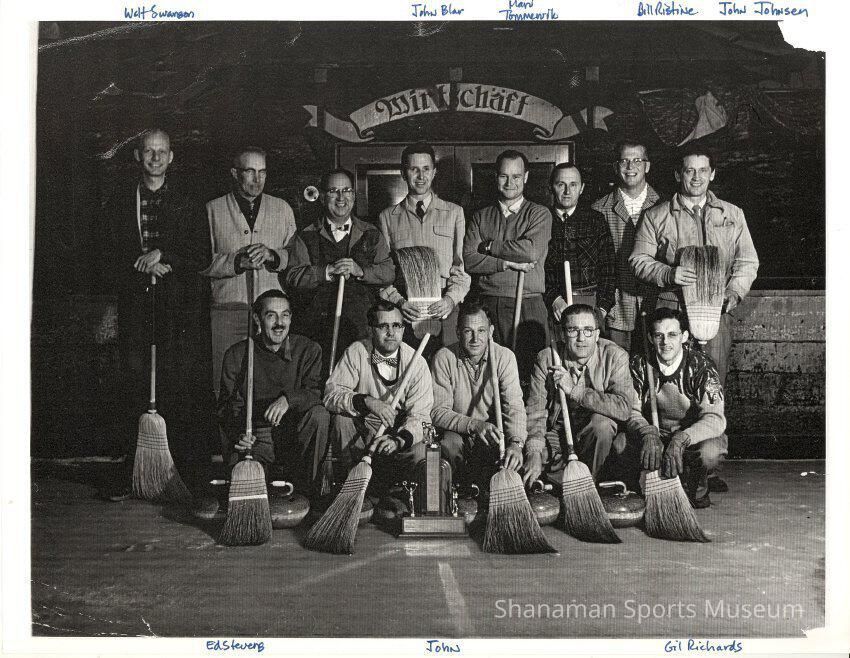 photocopy of photograph of a curling team. Back Row, L-R: Walt Swanson, unknown, unknown, John Blar, Marv Tommervik, unknown, Bill Ristine, John Johnsen. Front Row: Ed Stevens, far left, Gil Richards, far right.
