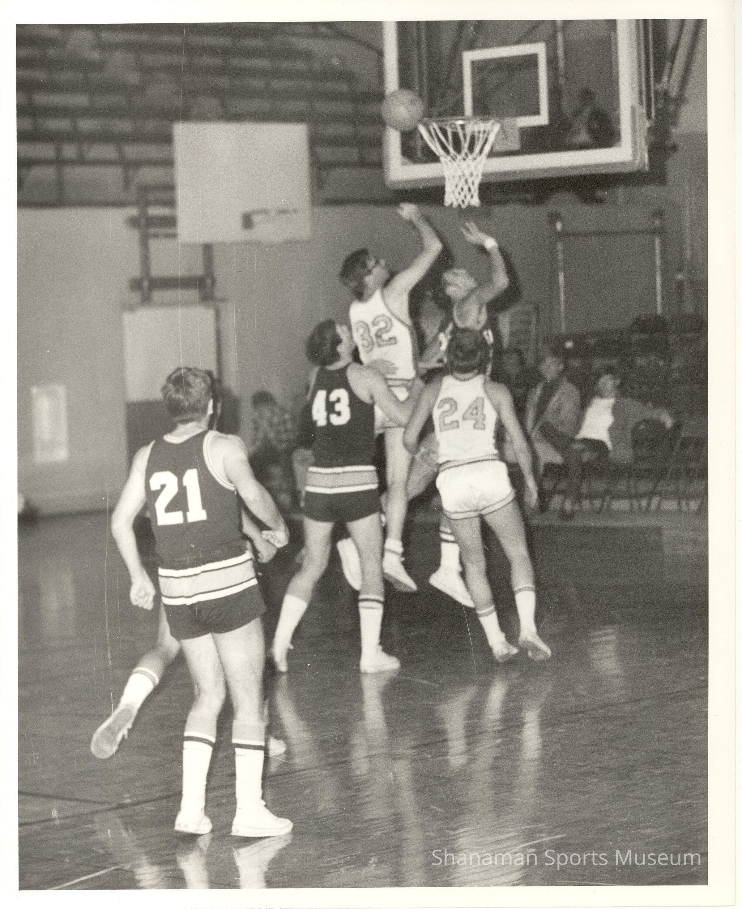 No. 32 for the Knights (white jersey) and five other players, including three members of the Falcons, compete for a missed shot during a college basketball game in an unknown year or location.Lexicon