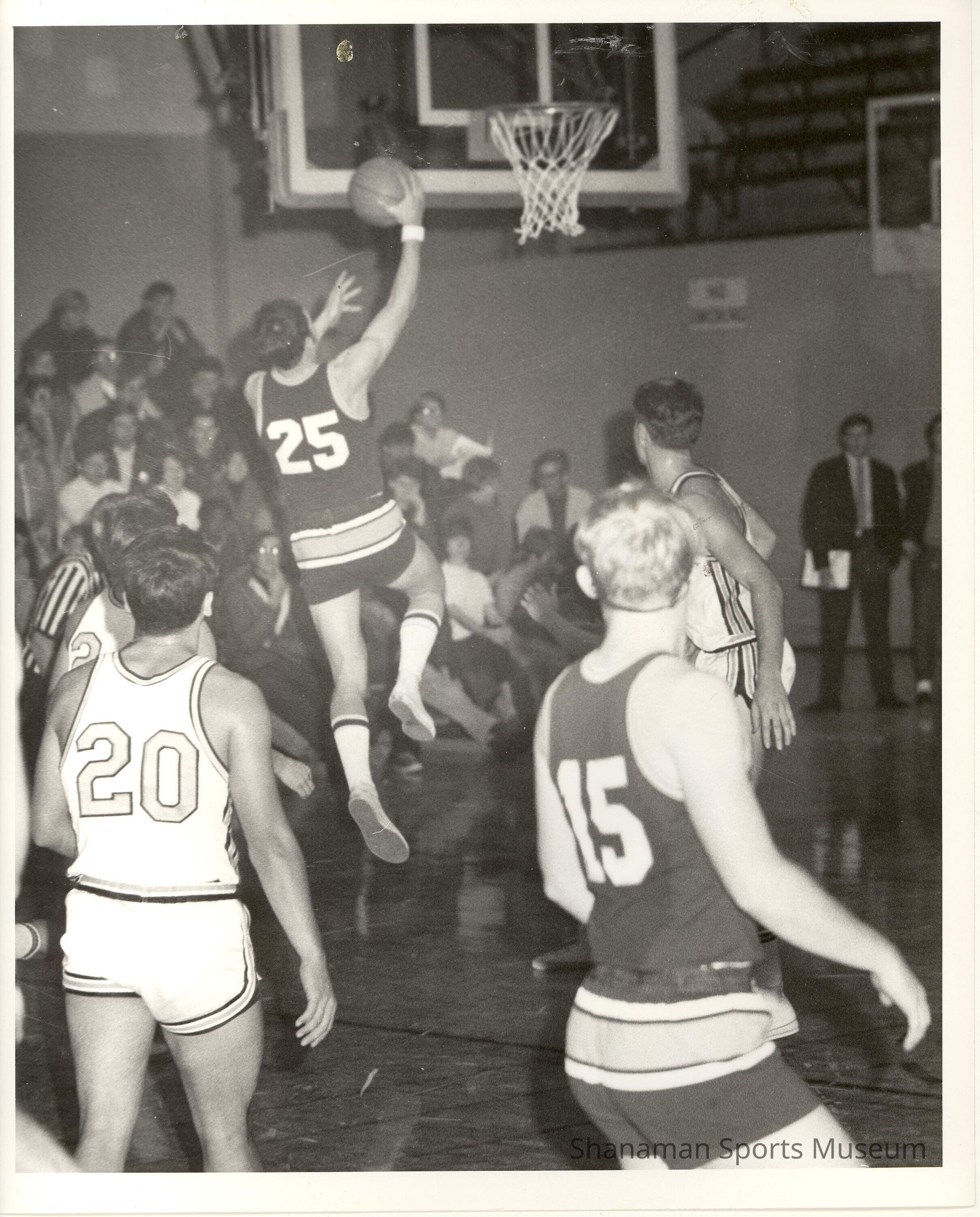 No. 25 for the Falcons (dark jersey) gets past three members of the Knights to attempt a layup during a college basketball game in an unknown year or locationLexicon