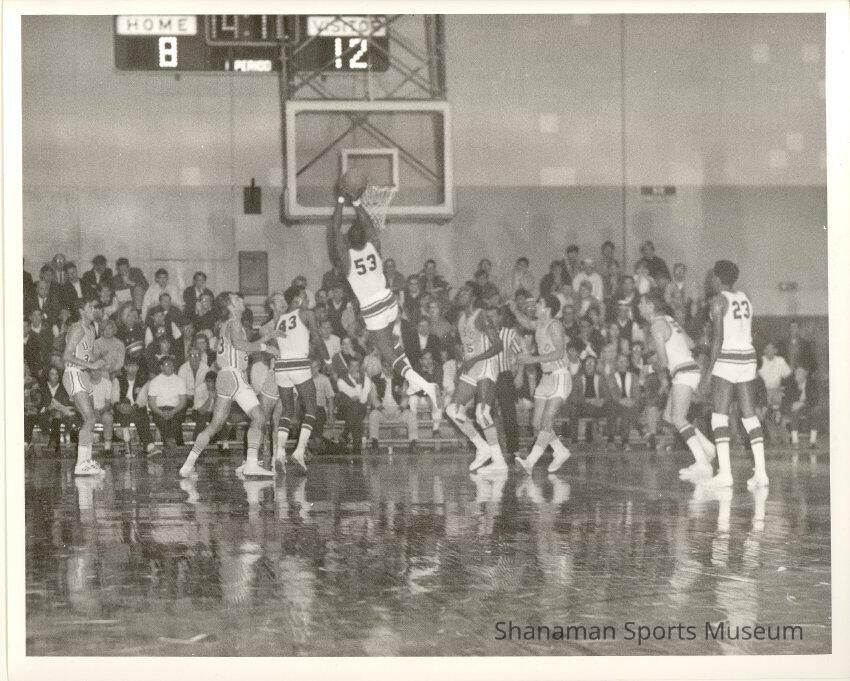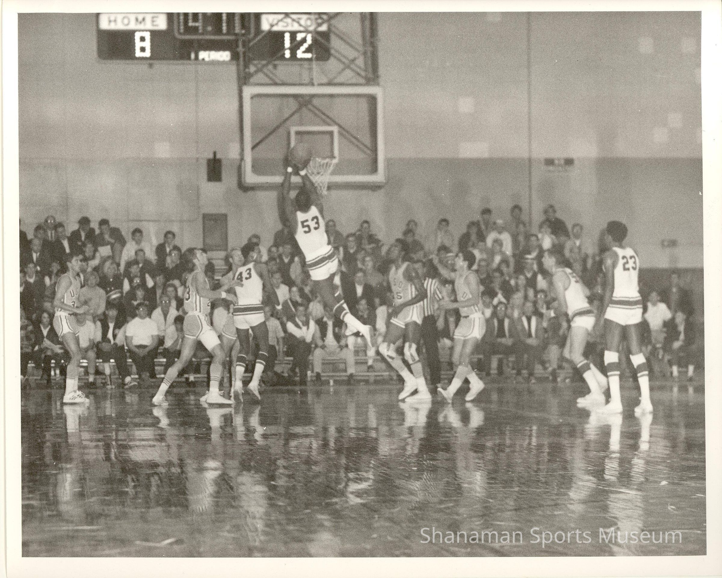 University of Puget Sound’s Argie Rhymes goes for layup in this black-and-white photograph. UPS took on the University of San Diego at the Daffodil Classic College Basketball Tournament held in 1968 at the UPS Fieldhouse. Rhymes’ talent and skill put him on the All-Time Classic top 10 list in rebounding (sixth, 24), single-game rebounding (third, 24), and single-game scoring (46). The classic was the first event for the annual Daffodil Festival that combined and celebrated the cities of Puyallup, Tacoma, Sumner and Orting. The tournament featured four teams, UPS, USD, Pacific Lutheran and Seattle Pacific.Lexicon