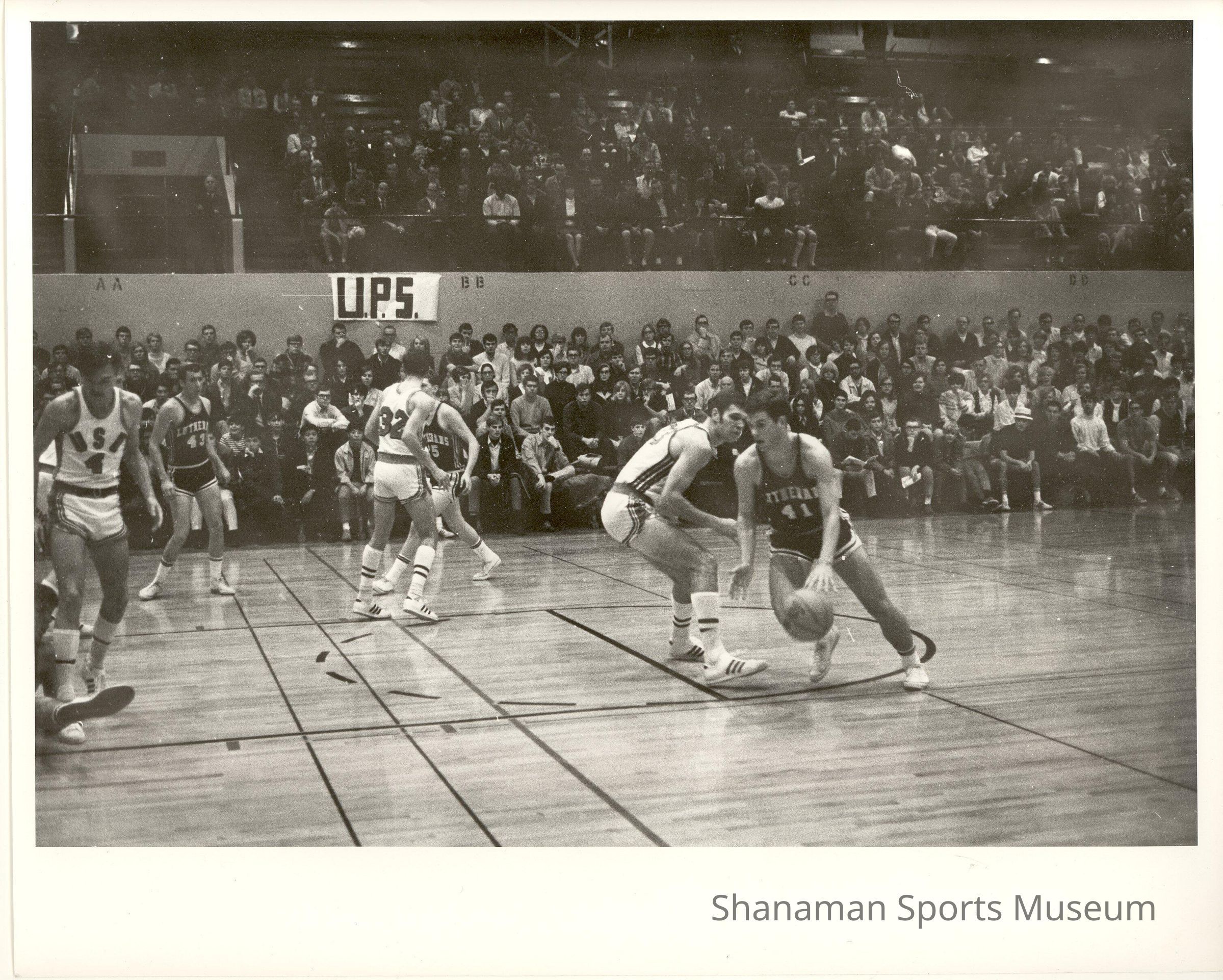 Pacific Lutheran University takes on longtime rival University of Puget Sound in a game packed with fans at the Loggers' Fieldhouse in a non-conference game. A UPS sign is on the wall of the stadium. The PLU Lutes won their conference title six times in the 1970s and placed second once.Lexicon