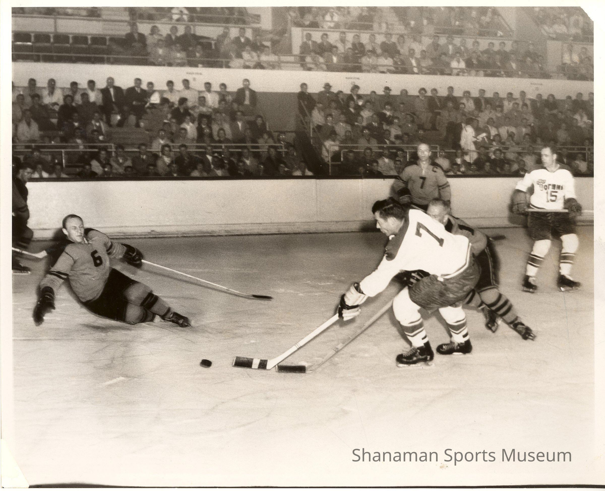 Hockey legend, player #7, Guyle Fielder, shown in a photo from his days with the Seattle Totems, played his junior career mostly for the Totems in the 1950s-60s. He went on to an illustrious, and somewhat short-lived, NHL career finishing fourth in scoring for his career behind only Wayne Gretzky, Jaromir Jagr and Gordie Howe. Fielder played 22 seasons in the Western Hockey League and became its biggest star at the time. Fielder won rookie of the year in 1952, was a six-time league MVP, league scoring leader nine times, three-time honoree as the game’s most gentlemanly player and had four season of more than 100 points.
