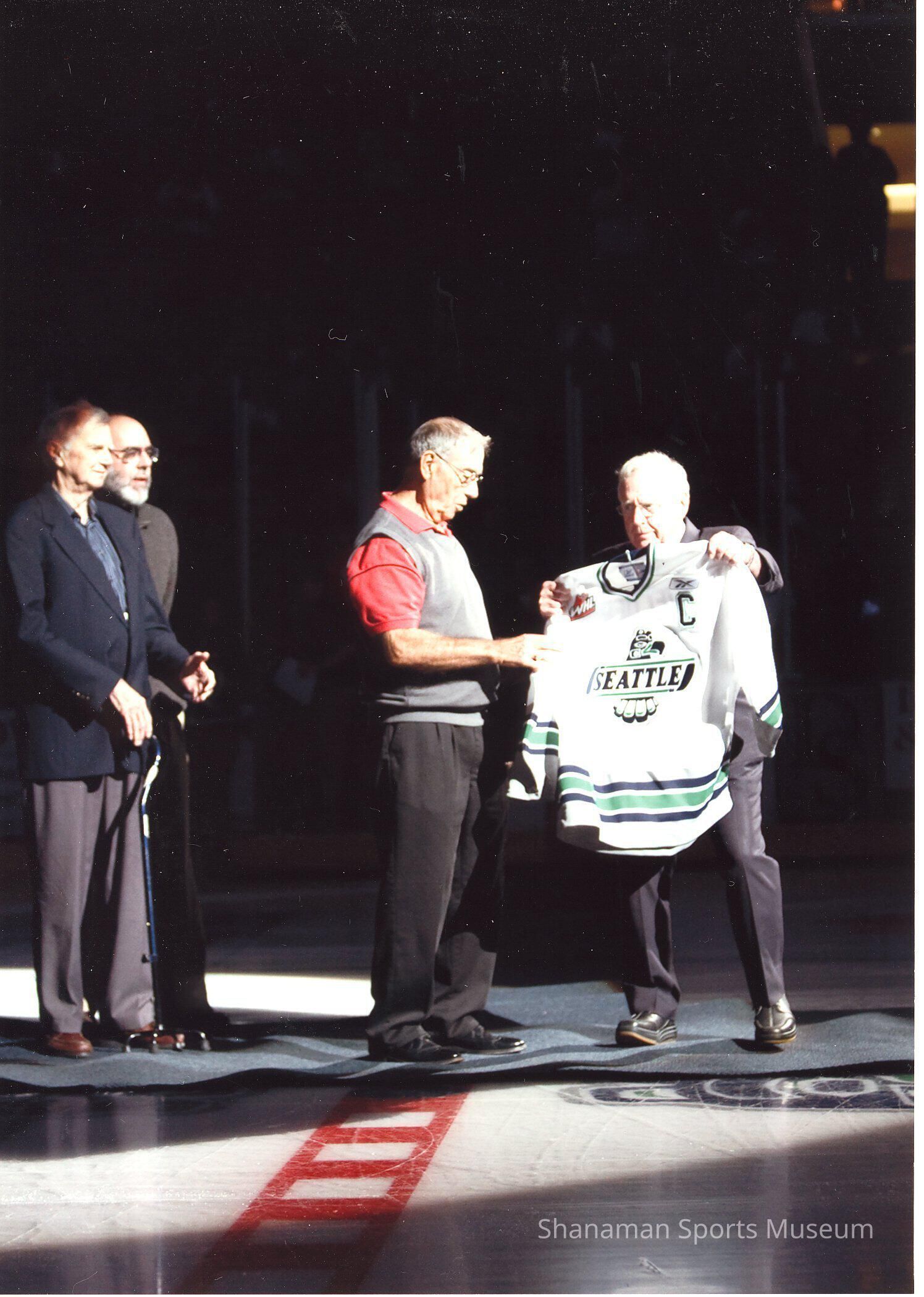 Hockey legend Guyle Fielder accepts a Seattle Thunderbirds jersey before the start of a WHL Thunderbirds game in 2009. Fielder, who played his junior career mostly for the Seattle Totems in the 1950s-60s, went on to an illustrious, although short-lived, NHL career finishing fourth in scoring for his career behind only Wayne Gretzky, Jaromir Jagr and Gordie Howe. Fielder played 22 seasons in the Western Hockey League and became its biggest star at the time. Fielder won rookie of the year in 1952, was a six-time league MVP, league scoring leader nine times, three-time honoree as the game’s most gentlemanly player and had four season of more than 100 points.