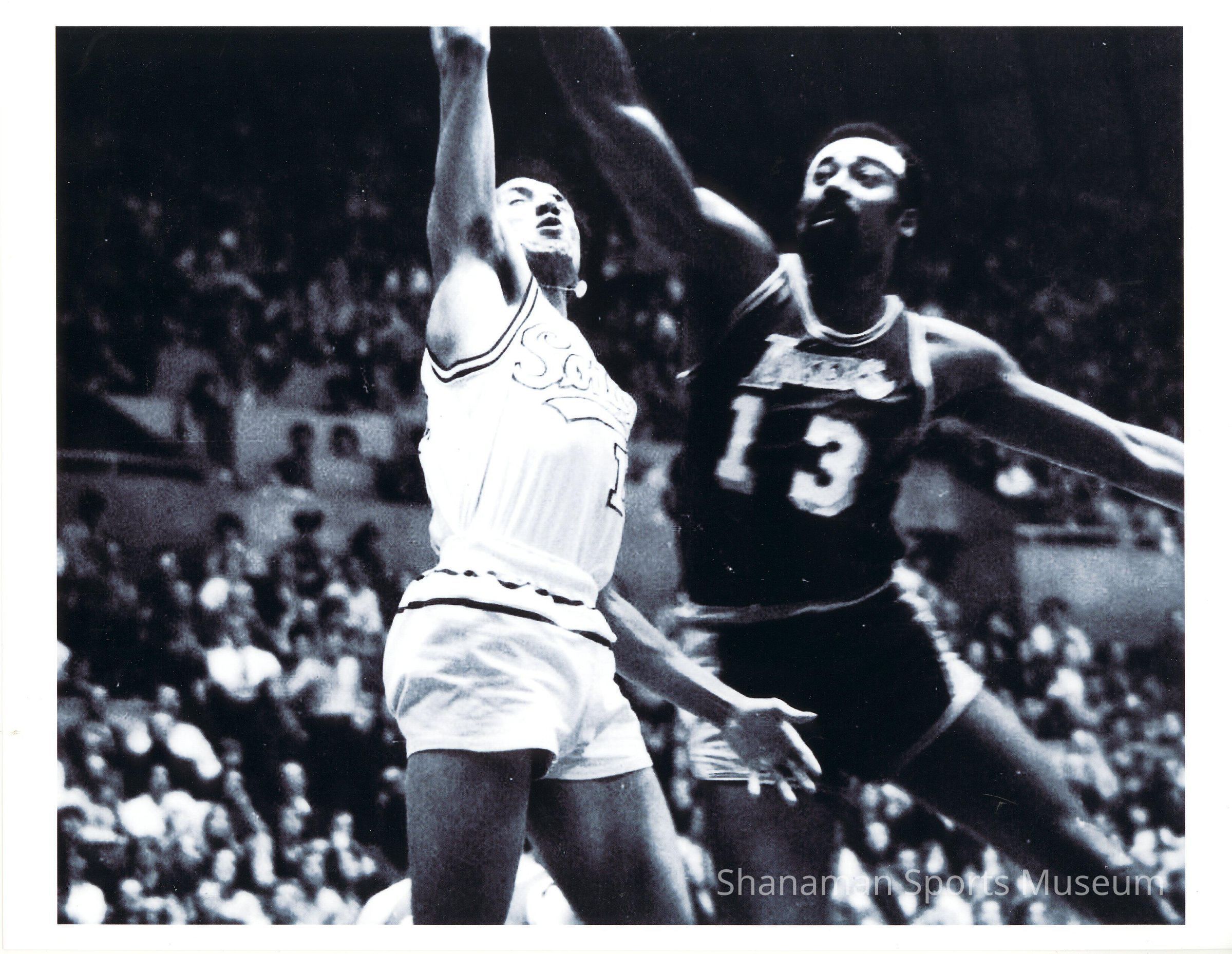 Photograph- b/w of Lenny Wilkens reaching for basketball against Lakers player while playing for the Seattle Sonics.Lexicon