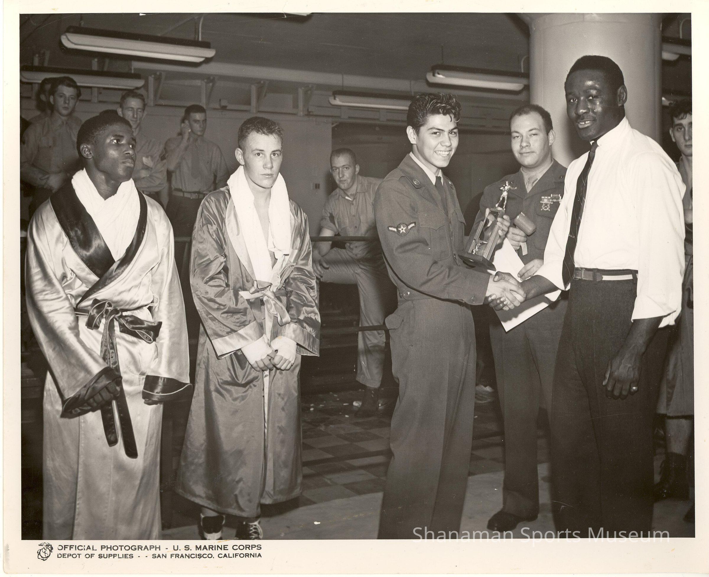 B/w original photograph, L-R: Willie Morton, Ruggles Larson, Bobby Aragon, ring announcer and Ezzard Charles. Parks Air Force Base vs. US Marine Corp Depot of Supplies, December 18, 1953.
