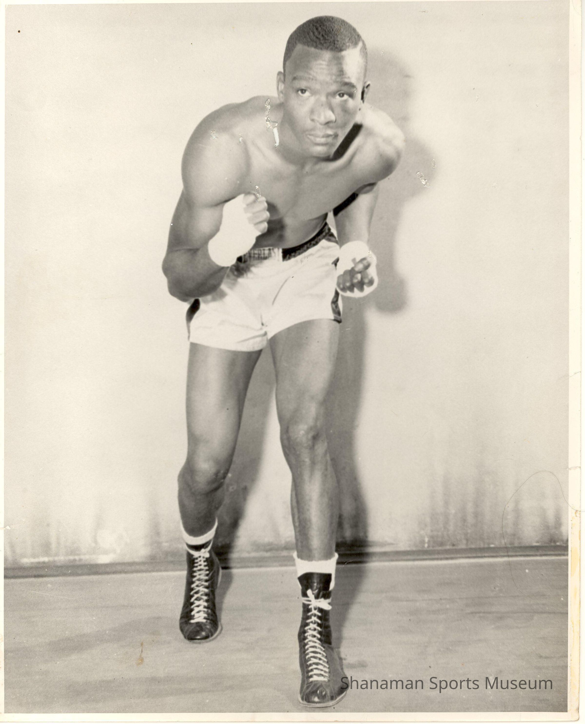 George Wright, who was nicknamed “Sonny,” was a solid, “crowd pleasing” middleweight from Tacoma. Wright was 22 years old in this photo, was a Washington State middleweight champion and he later became a trainer for some talented boxers like Sugar Ray Seales, who won a Gold Medal in the Olympics. Wright was named to the Tacoma-Pierce County Sports Hall of Fame. Wright was 6-1 ½ feet tall and weighed 160 pounds when he boxed. He was managed and trained by Bobby Richards.Lexicon