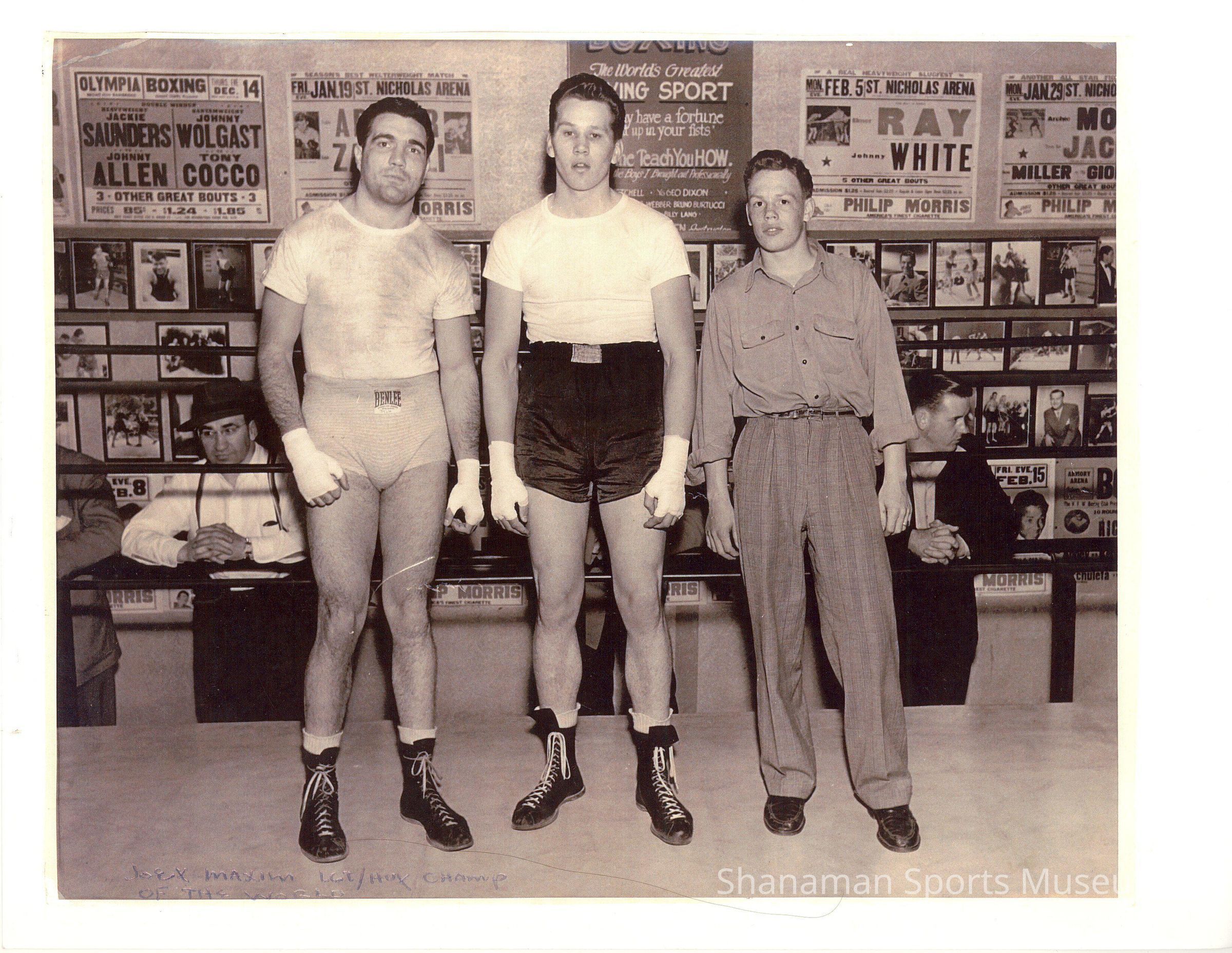photocopy of photograph of L-R: Joey Maxim, Dave Davey and Ruggles Larson standing in boxing ring. Maxim won a 10 round decision over Roy Hawkins on May 27, 1948 at Tacoma Ice Arena. Maxim won the worlds light heavyweight title on Jan. 24, 1950 in London by stopping Freddie Mills. Maxim retired in 1959 and was elected to the Boxing Hall of Fame in 1975. Roy Hawkins was managed by Jack Conners and boxed out of Tacoma. He was originally from Kalamath Falls, OR. Dave Davey was from Puyallup and moved to Tacoma and boxed for Homer Amundsen. Larson was an amateur boxer for Homer Admundsen.Relationships