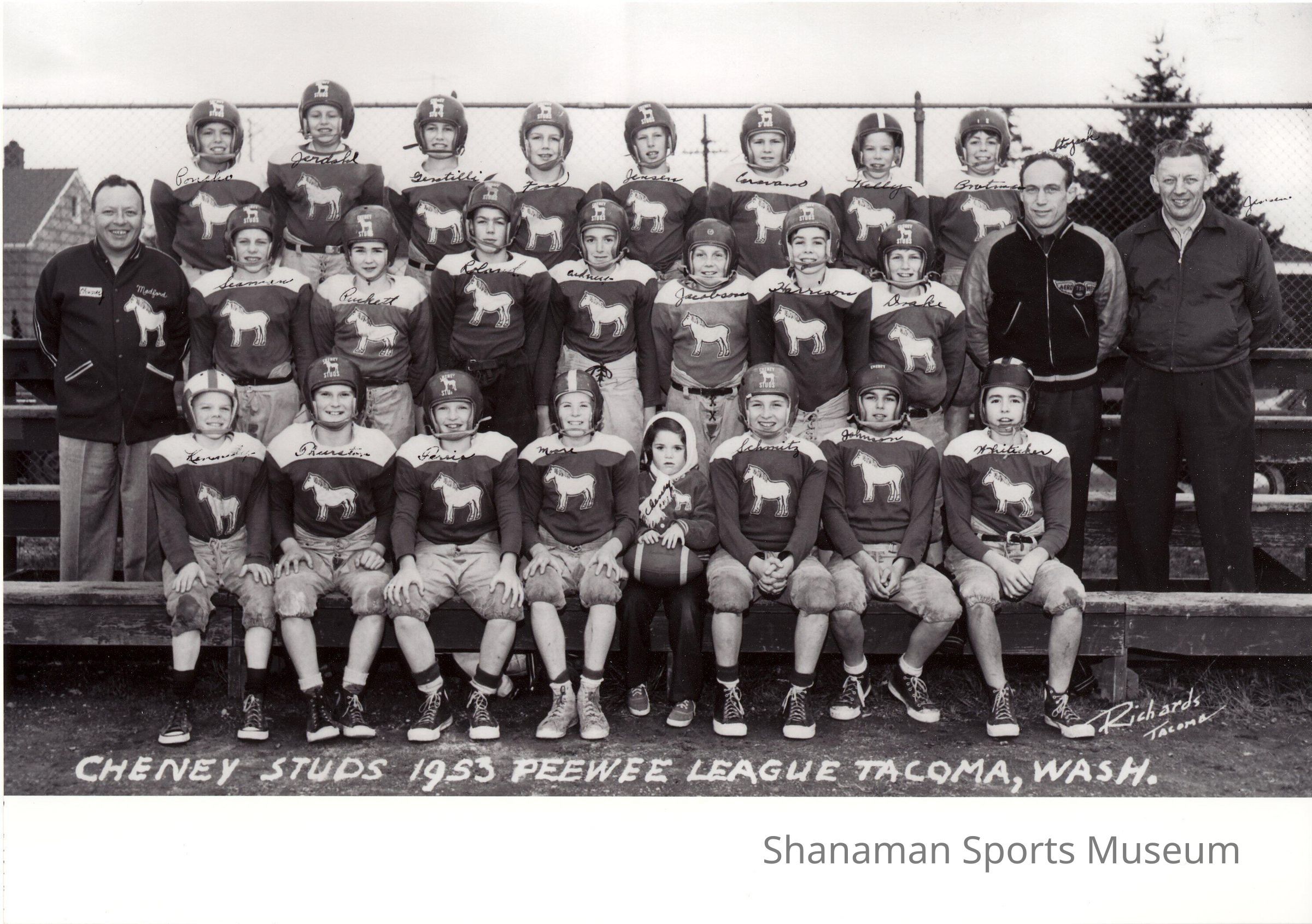 Here is a black-and-white photo of the 1953 Cheney Studs Pee Wee football team in Tacoma. Ben Cheney, a successful businessman in timber, was a financial supporter of the Cheney Studs, which had teams in football, basketball, baseball and hockey. Over the years, Cheney opened the doors for thousands of youths to play sports. “Ben was the greatest friend of youth that Tacoma ever had,” said Doug McArthur. Cheney Stadium, home of the Tacoma Rainiers, is named after Ben Cheney, who was also a huge supporter of Tacoma's Triple A minor league baseball teams. Jerry Cudney, who was active in sports while growing up in Tacoma, was on this 1953 Cheney Studs team in this photo. At age 11 in 1952, Cudney played on the Pee-Wee league champs in baseball and in 1953 he played on the Pee-Wee champs in hockey. The photo was donated by Cudney.Lexicon
