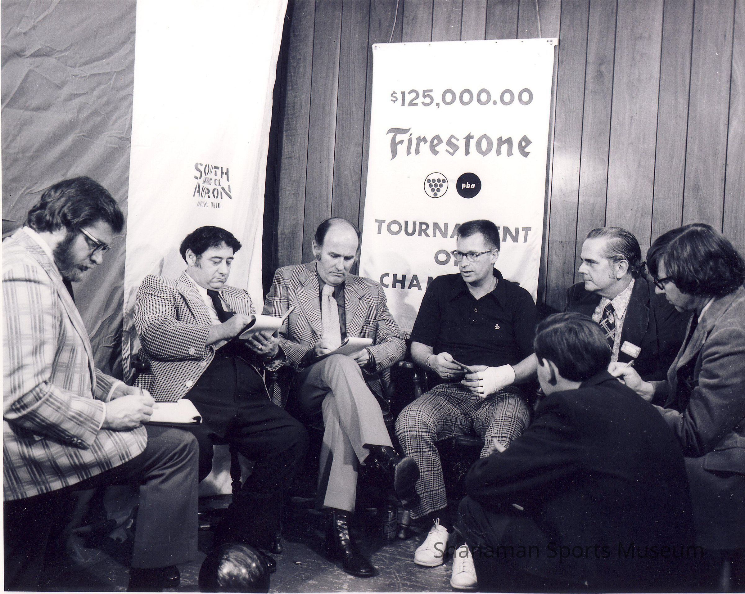 Tacoma's famous bowler Earl Anthony is interviewed by a group of reporters after he won his first Firestone Tournament of Champions tournament in 1974 at Riviera Lanes in Akron, Ohio. Included in the photo are longtime Tacoma News Tribune's sportswriter Mike Ingraham (right, back to the camera), New Jersey columnist and sportswriter Chuck Pezzano (second from the left), and Mort Luby, Jr. of Chicago's Bowlers Journal (third from left). Anthony won 41 PBA's national tour titles and eight major PBA tournaments – both more than any pro bowler in history of the PBA. He was the PBA Player of the Year an unprecedented six times. He joined the PBA Tour in 1963 and became the PBA's all-time winningest player by 1976. He joined the senior tour in 1988 and won seven more titles. Ingraham was a sportswriter for the Tacoma News Tribune for more than 20 years, often covering local and national bowling tournaments. The PBA recognized Ingraham in the 1970s for writing about more pro bowling tournaments than any other sportswriter in the country.Lexicon