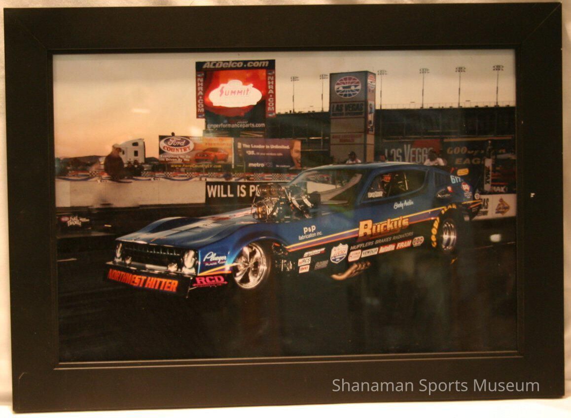 Photo of Bucky Austin's famed race car that he drove on the Pacific Raceways near Seattle and at race tracks across the country. He raced in the National Hot Rod Association (NHRA). He won four NHRA Top Alcohol Funny Car championships between 1987-1991. His 62 wins between 1985 and 1996 were the most for any driver. In 2000, he got his 70th career victory, which ranked him fourth all-time on the NHRA win list.Lexicon