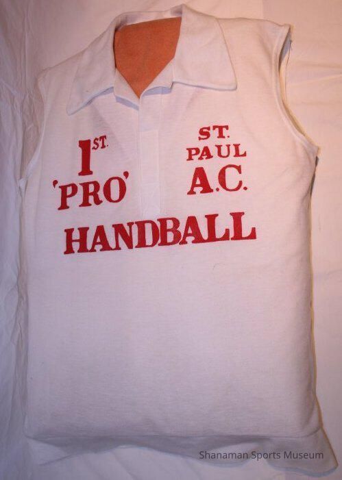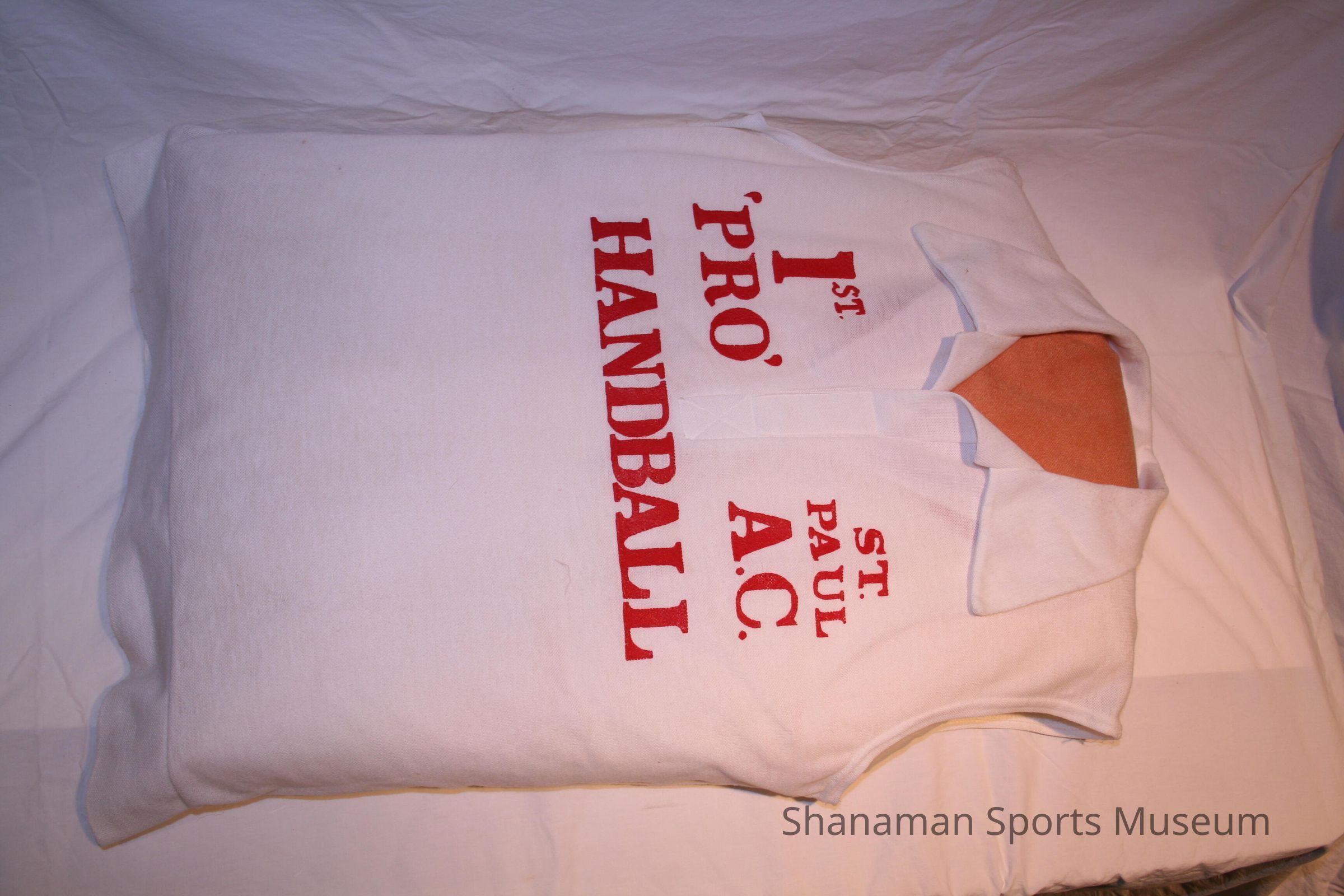 The white shirt has “1st ‘Pro’ “ printed on the right side front, St. Paul A.C. on the left front, both above HANDBALL in red letters.