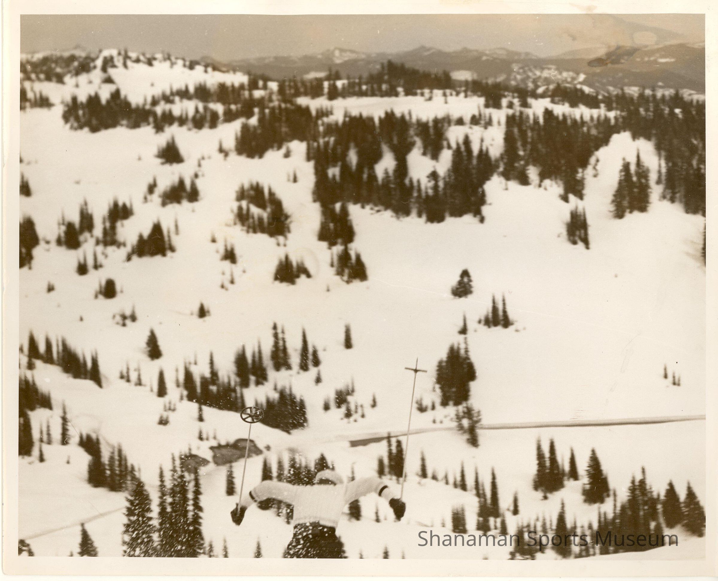With his ski poles raised high above his head, this skier races down the snow slopes on Mount Rainier with cabins below him. Paradise Lodge used to have a rope tow for skiers and it was a popular place for skiers and sledders. This photo was donated by Richie Nelson, a longtime ski instructor.Made/Created