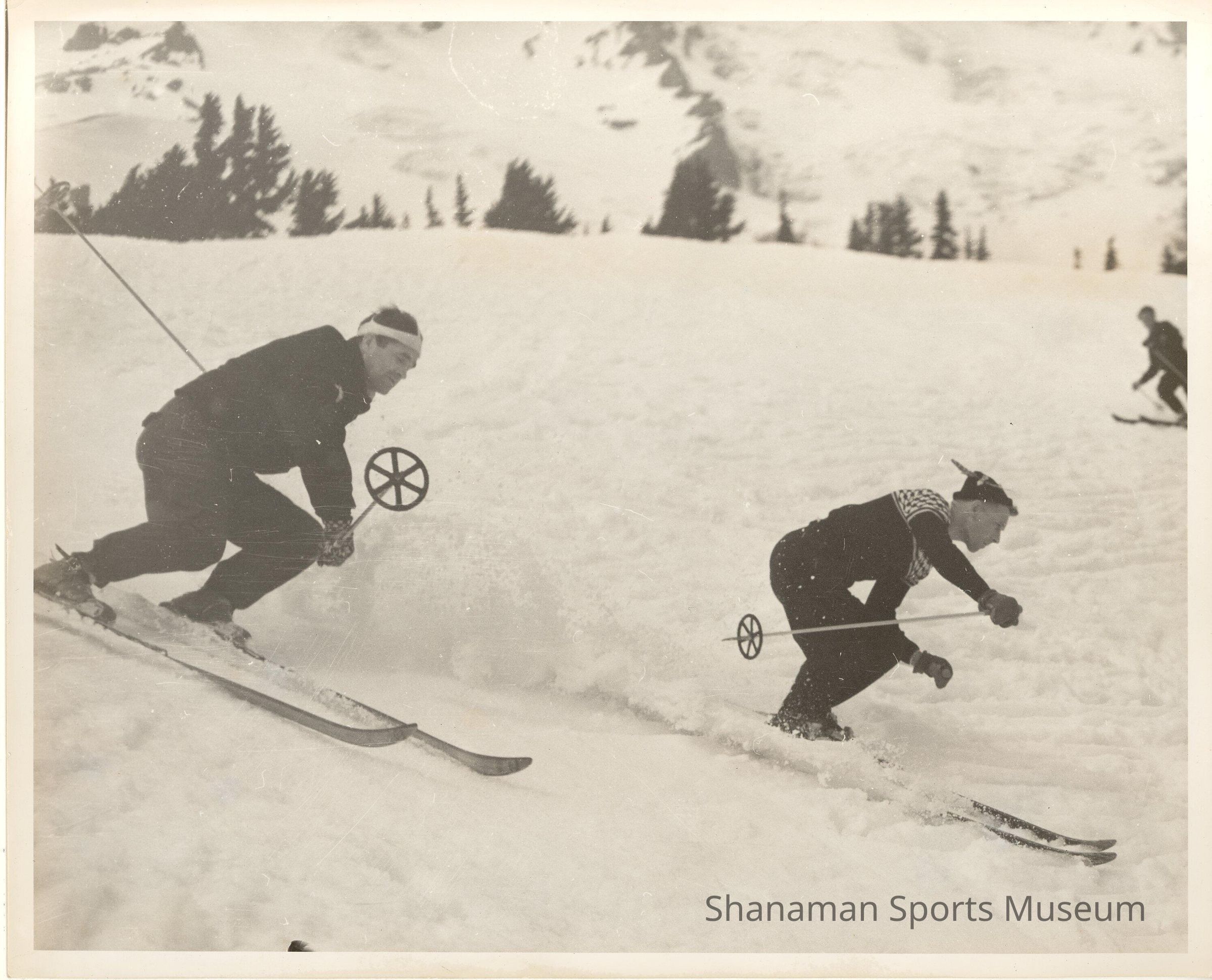 Richie Nelson (on the right) races down the slopes on his skis at Mount Rainier next to another skier. Nelson, a 1948 graduate from Lincoln High School, was a longtime skier instructor at Paradise. Besides being an avid skier and ski instructor, Nelson also played on Lincoln High School's hockey team when he attended school there in the late 1940s.Lexicon