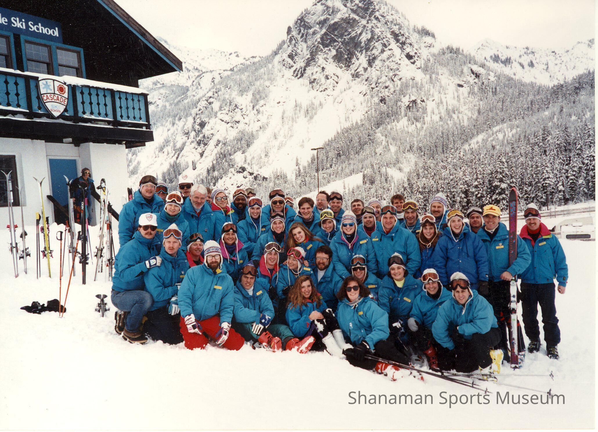 The Cascade Ski School instructors wearing their blue jackets poise for a picture next to their school building. Cascade Ski School opened in 1962 and is one of the oldest privately run ski and snowboard schools in Washington. With 100 instructors, they operate on two popular ski slopes – Summit West at Snoqualmie and Crystal Mountain. The photo was donated by Richie Nelson.Lexicon