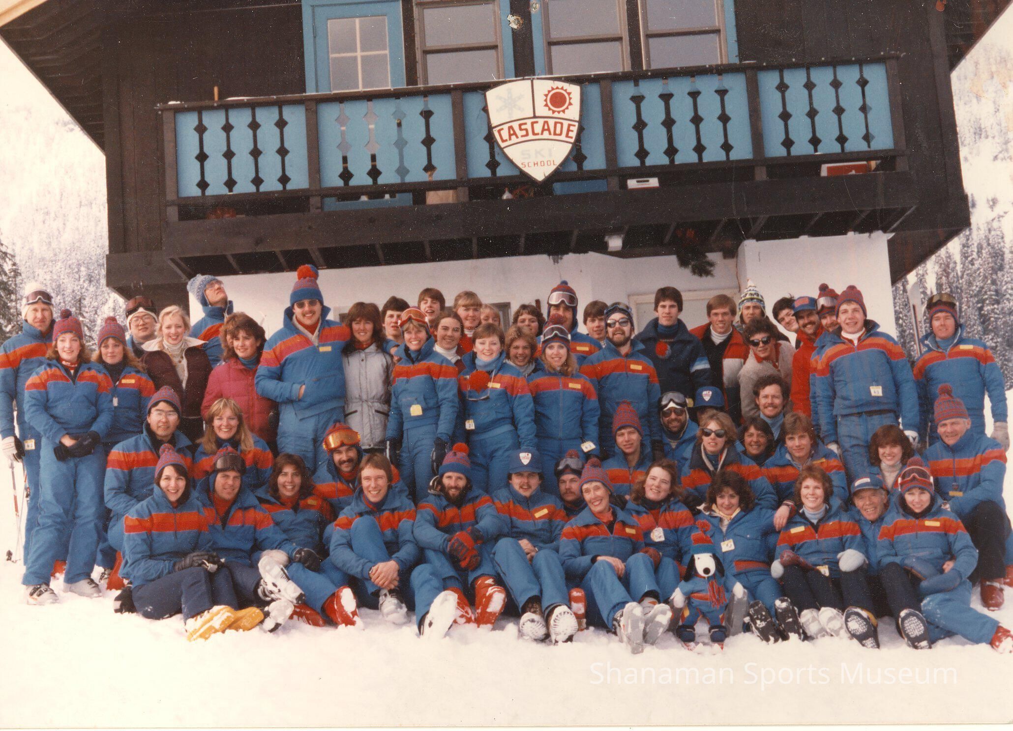 Outside of their school building on Snoqualmie Summit back in 1983, the Cascade Ski School instructors pose for a photo wearing their blue jackets with a red stripe. The ski school opened back in 1962 and has been family run for over 50 years. It is one of the oldest privately run ski and snowboard schools in Washington.Made/Created