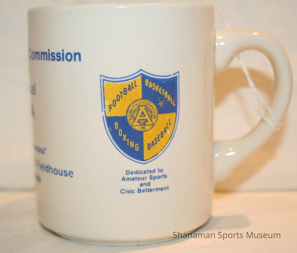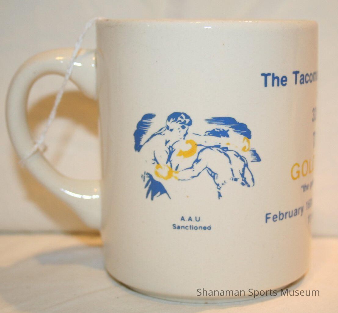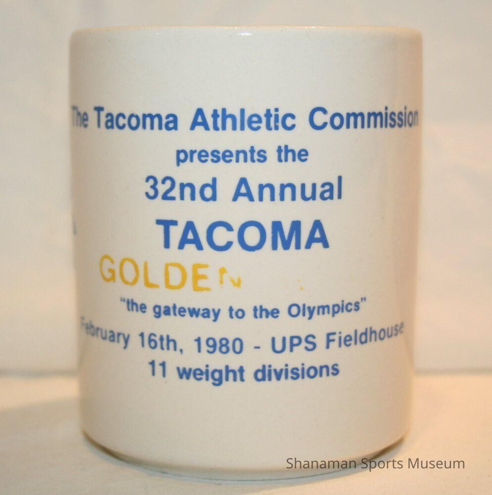 Printed on the mugs are “The Tacoma Athletic Commission presents the 32nd Annual Golden Gloves,” “the gateway to the Olympics,” “February 16th, 1980 – UPS Fieldhouse,” “11 weight divisions,” “Football, basketball, boxing, baseball” printed on a blue and yellow shield, “dedicated to Amateur Sports and Civic Betterment,” and a blue and yellow drawing of two boxers engaged in a bout above “A A U Sanctioned.”Lexicon