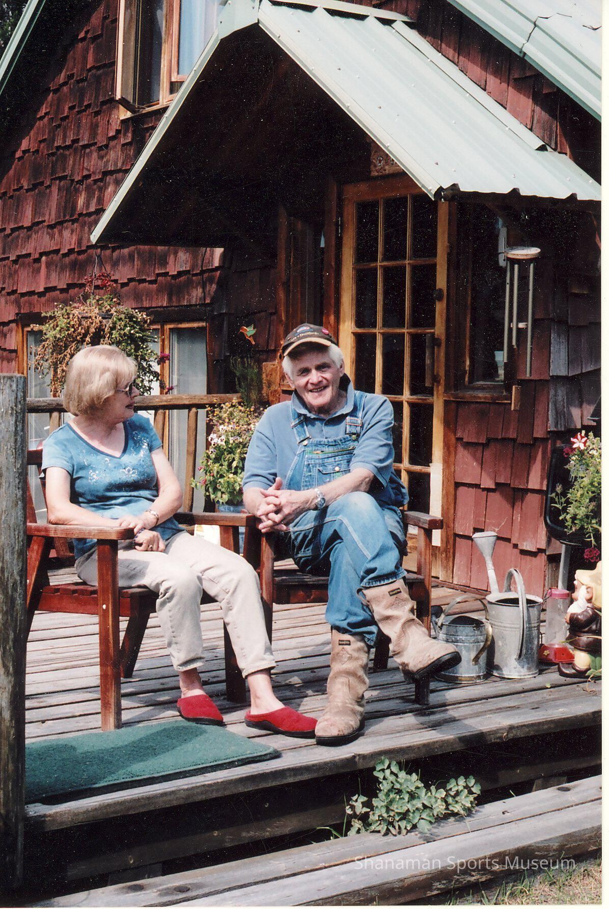 Richie Nelson sits with his wife sitting on the porch outside of a mountain cabin. Richie was a well-known ski instructor and taught young kids and adults how to ski for over three decades. Richie, a 1948 graduate from Lincoln High School, would reflect fondly on his memories of taking the train to Snoqualmie Pass to ski.Lexicon
