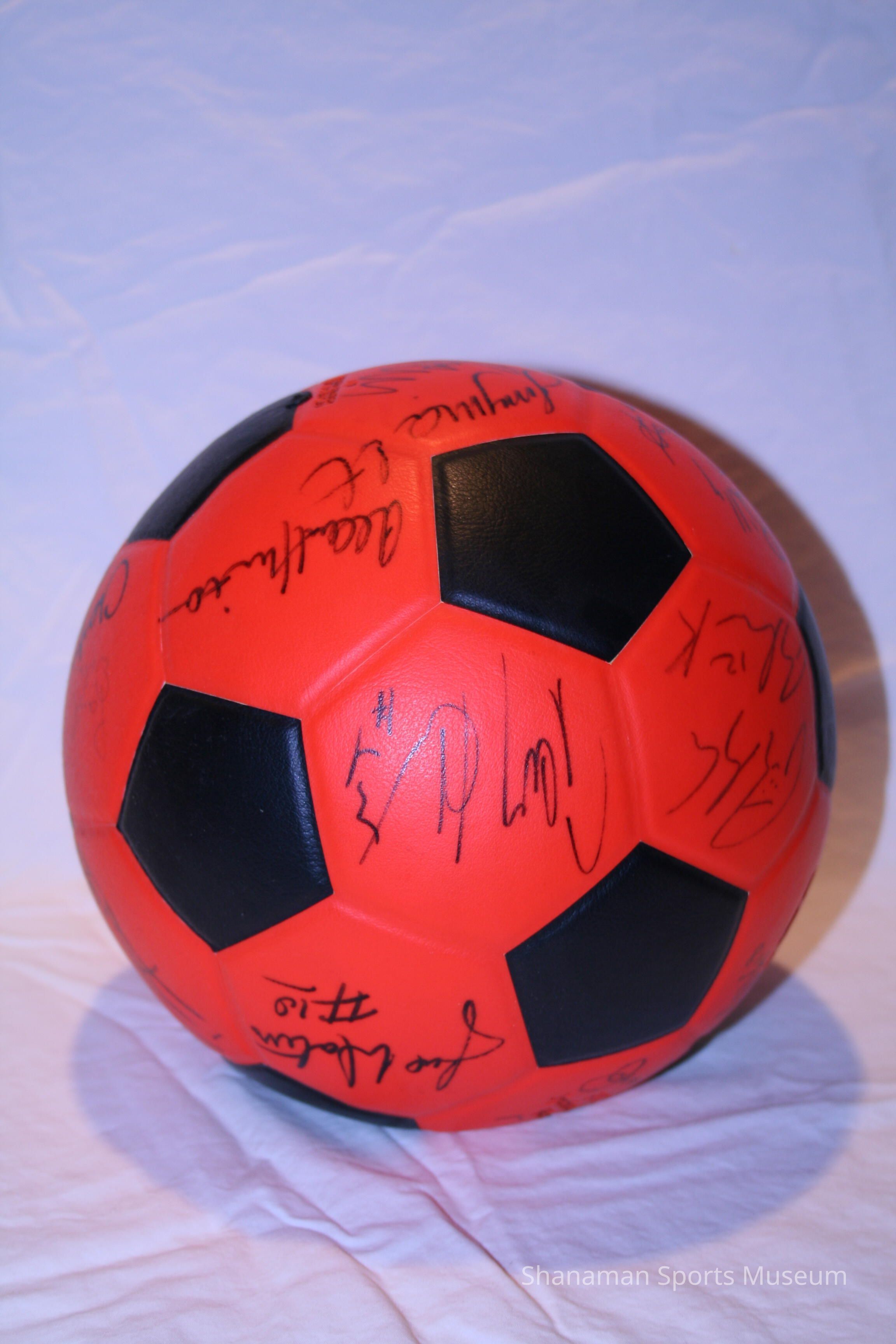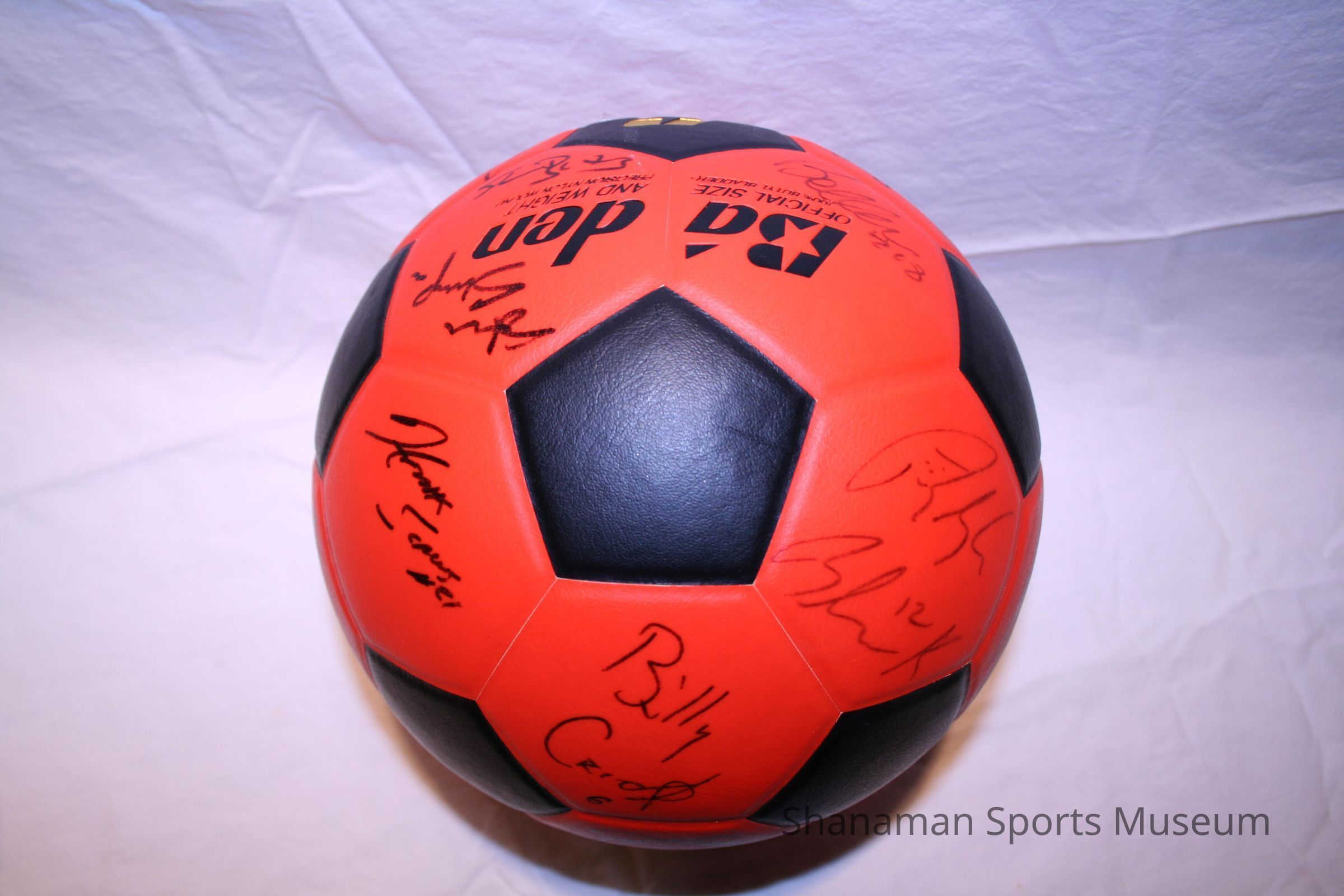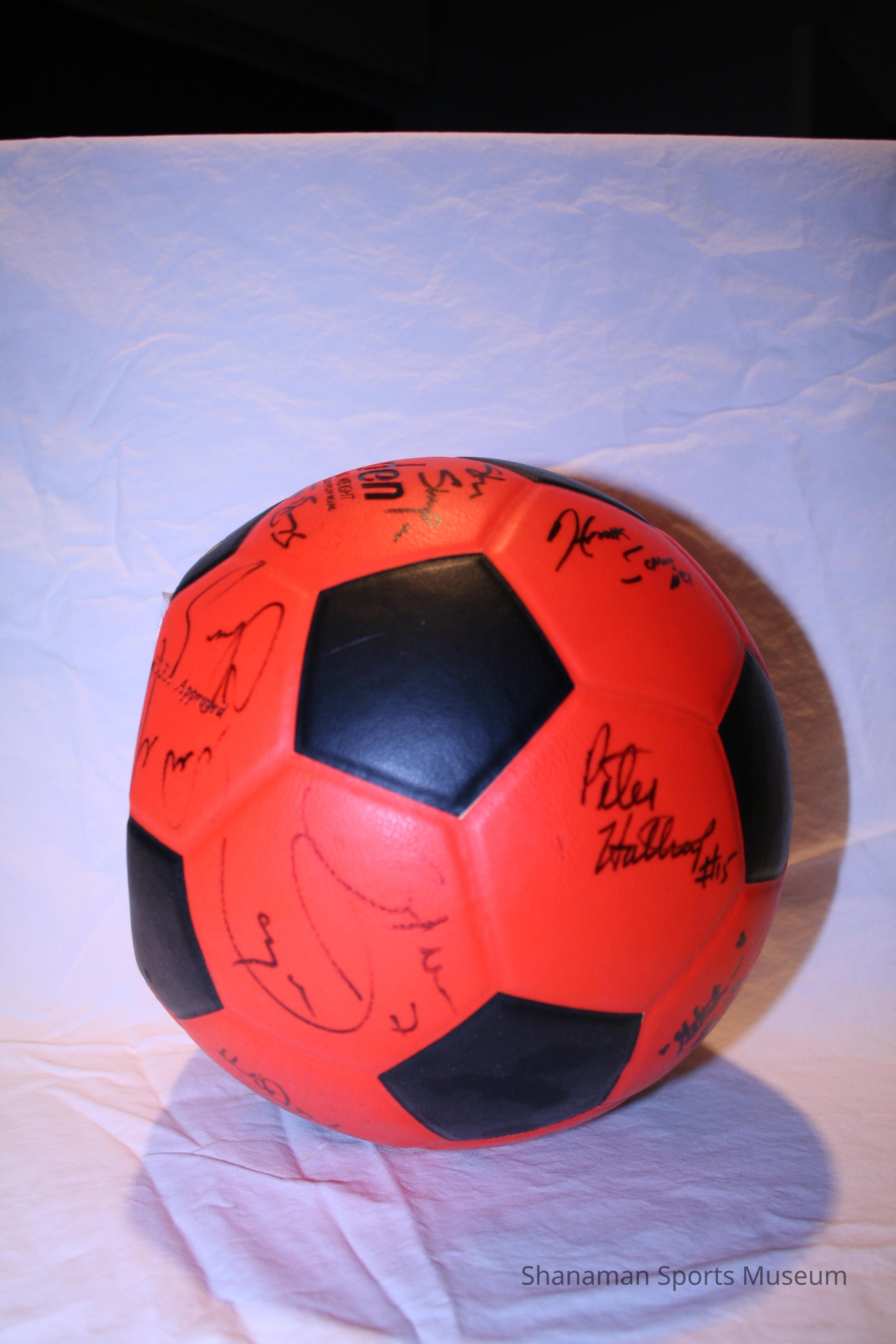 A red and black soccer ball autographed by members of the 1987-88 Tacoma Stars.