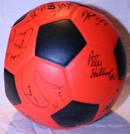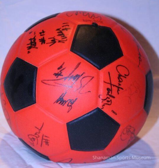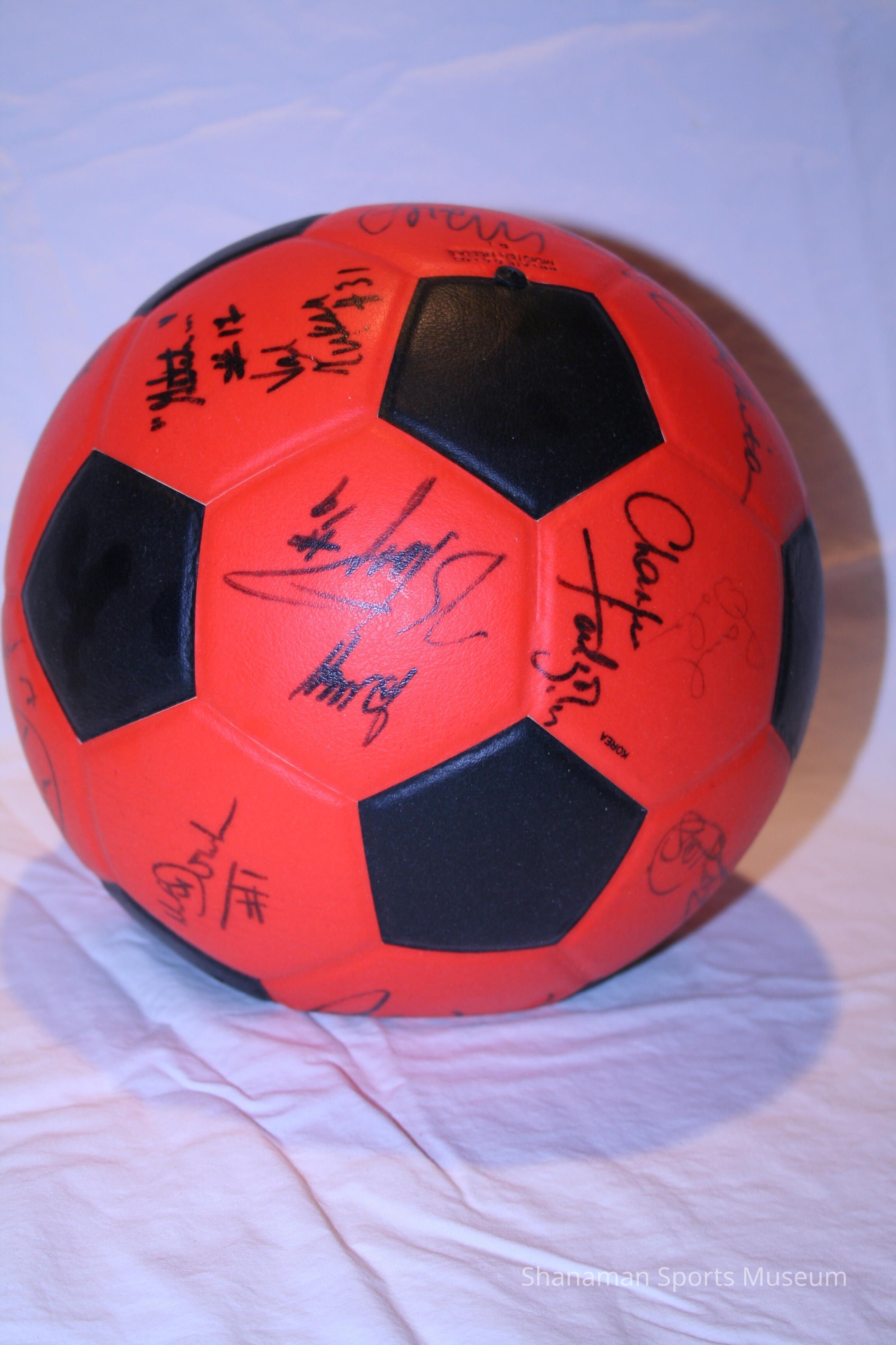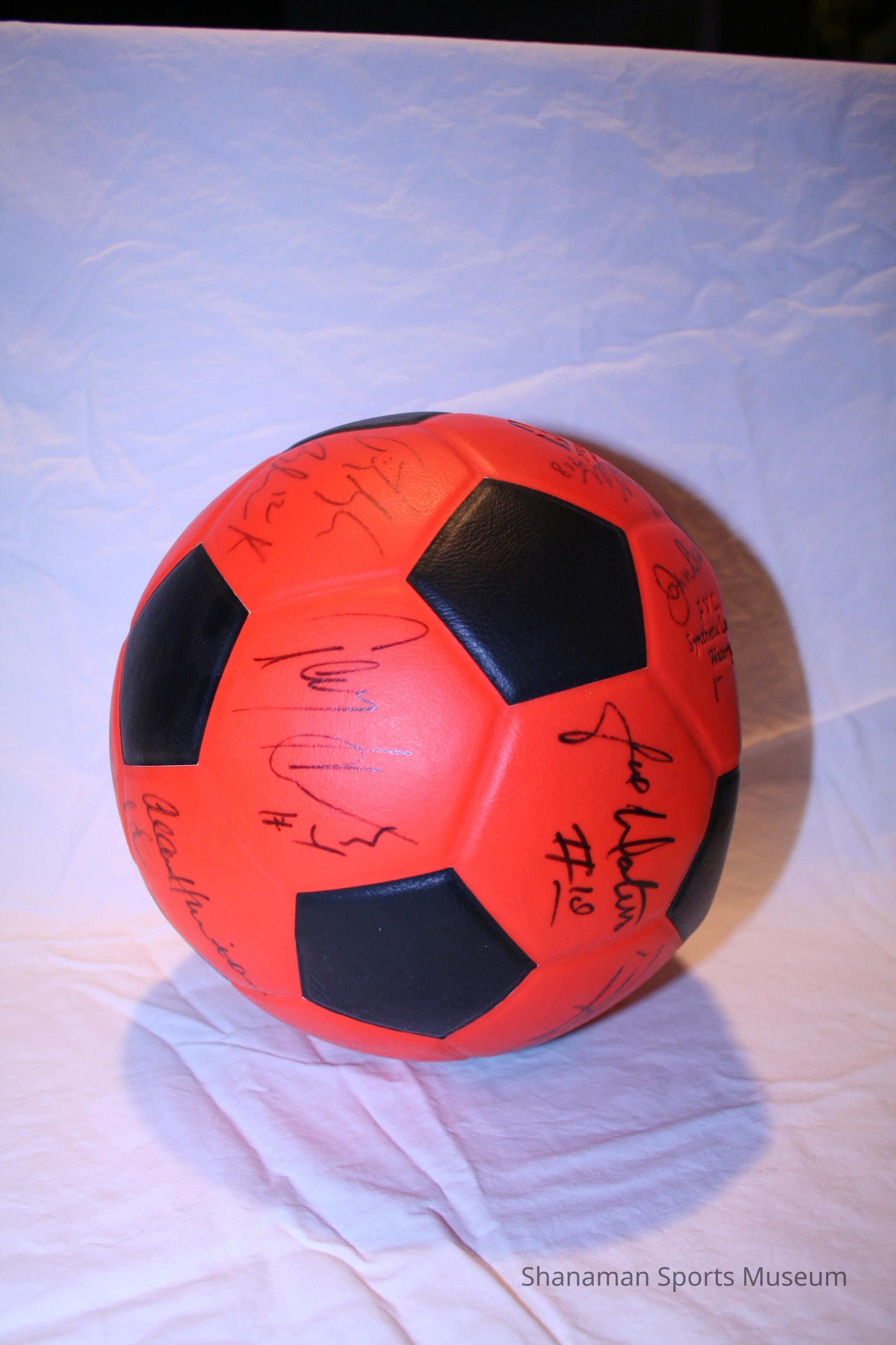 A red and black soccer ball autographed by members of the 1987-88 Tacoma Stars.
