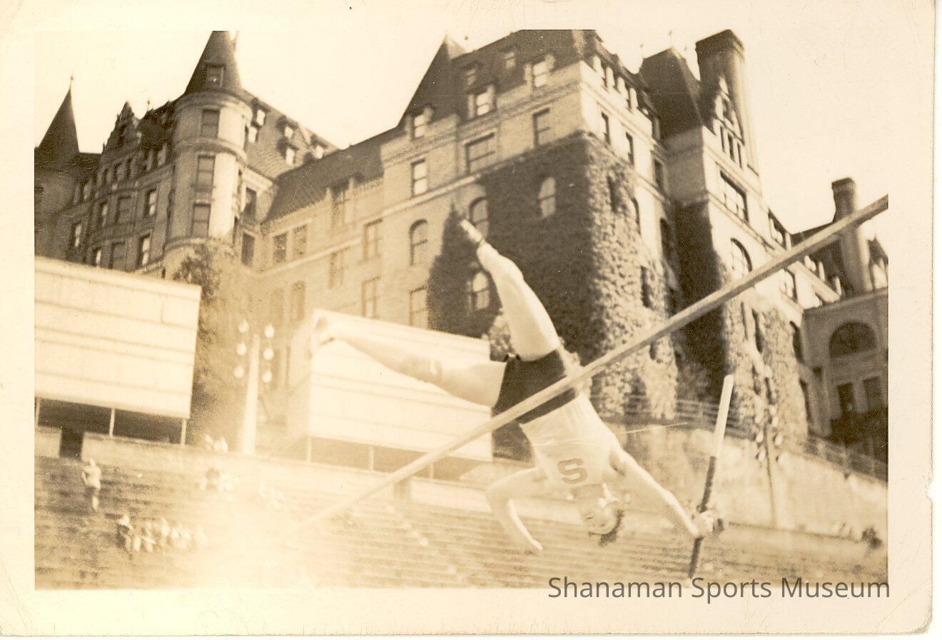 B/w photograph of Ray Payne pole vaulting at the Stadium High School track, c. 1943.Lexicon