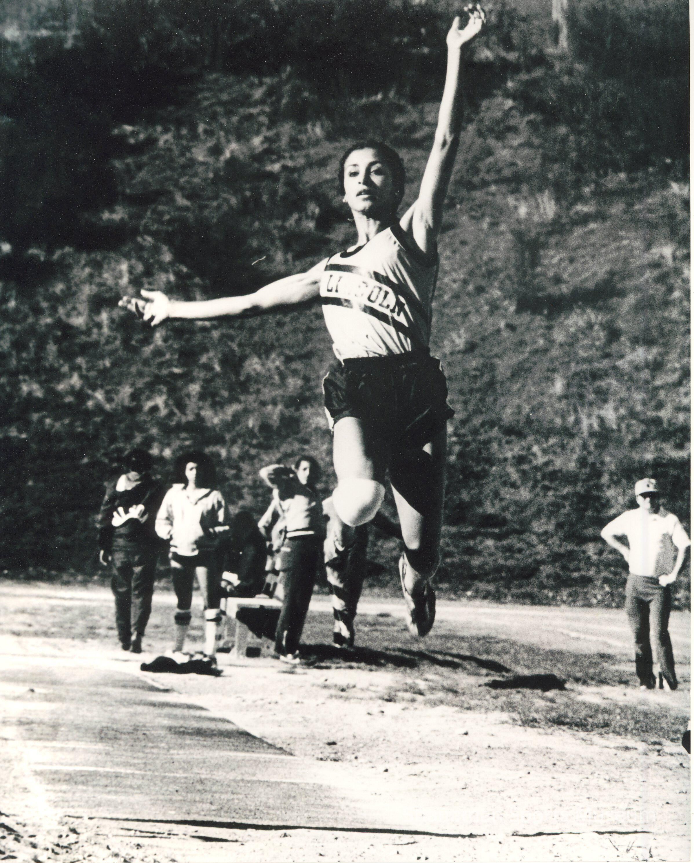 Lincoln High School track and field star Jakki Davis competes in the long jump during a meet in 1978.