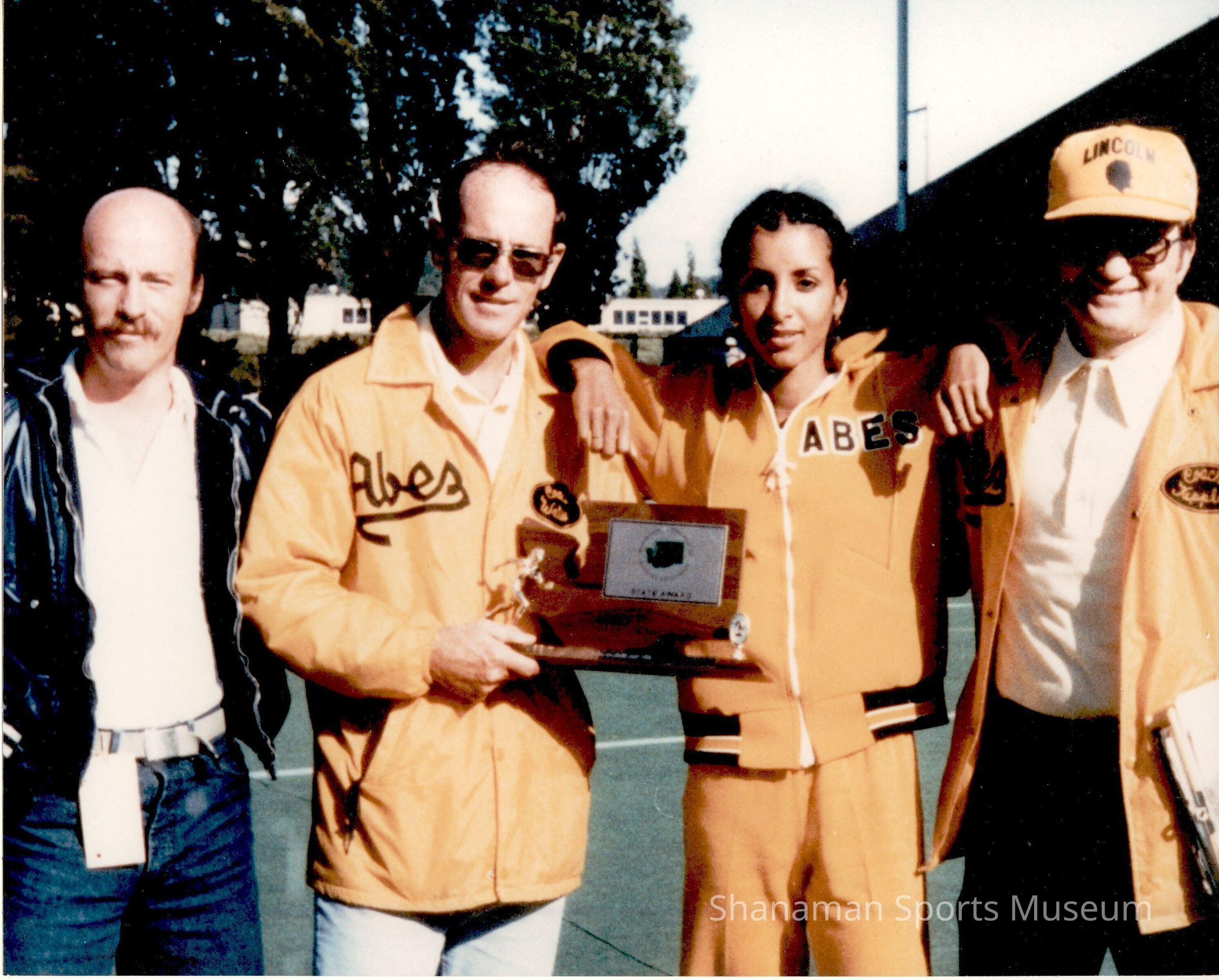 Lincoln High School track and field star Jakki Davis, second from right, poses with coaches (from left) Pat Clifton, Dan Watson (holding trophy) and Coach Kepler in 1978. Davis was inducted into the Tacoma-Pierce County Sports Hall of Fame in 2010.