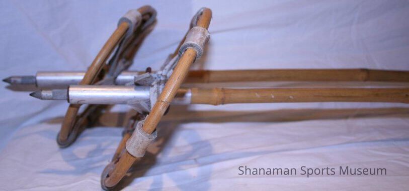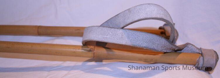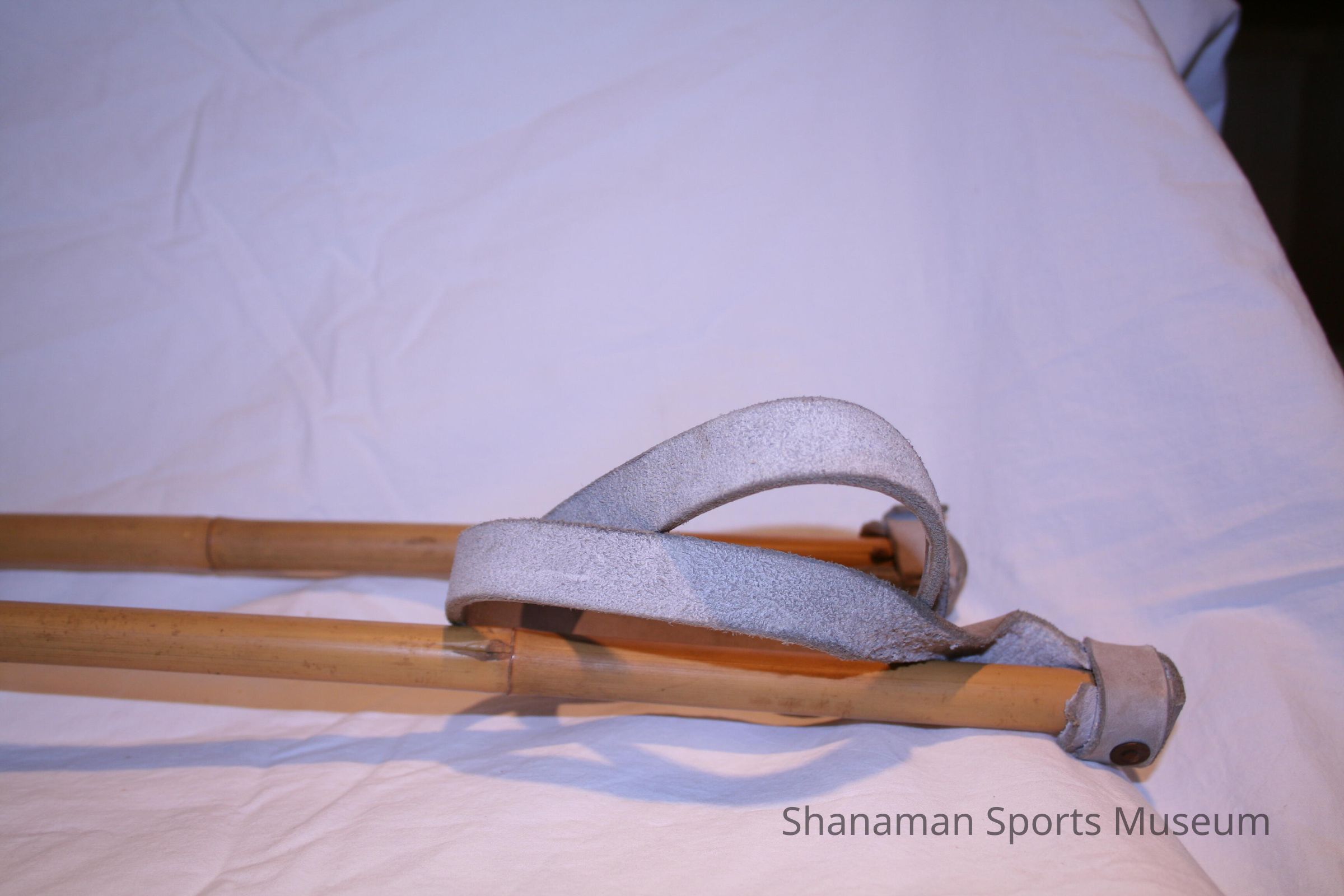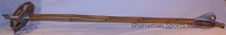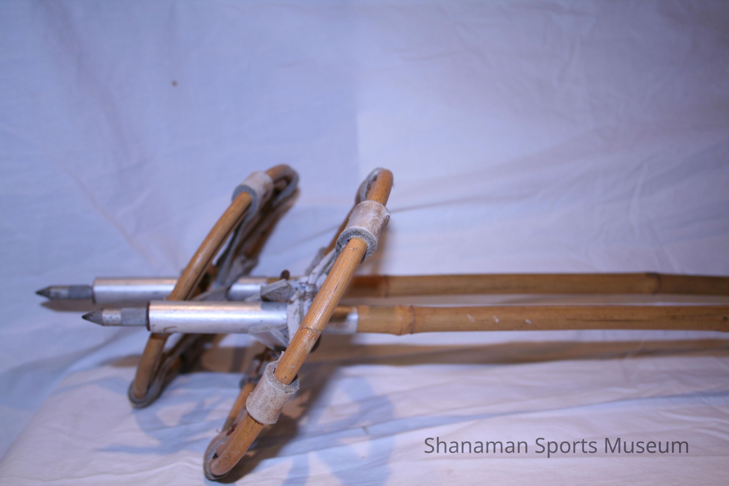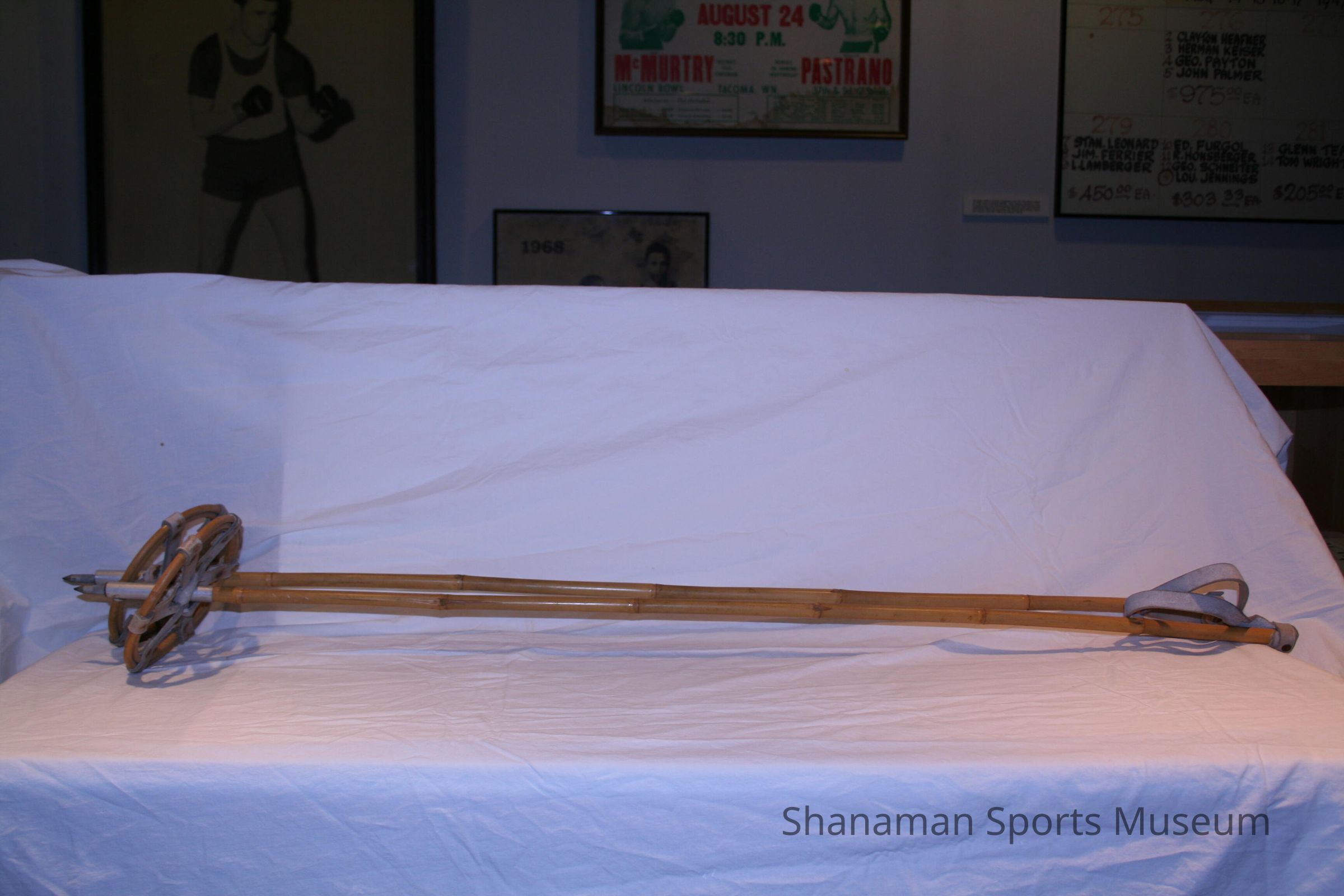 These 1920s-era ski poles were donated by 1942 National Combined Champion Shirley Fopp. With their oversized baskets, these bamboo poles were typical of those used by skiers on Mount Rainier at the time. Bamboo is lightweight, making it ideal for ski poles. Some still use bamboo poles today. However, aluminum and carbon fiber poles are much more common.Lexicon