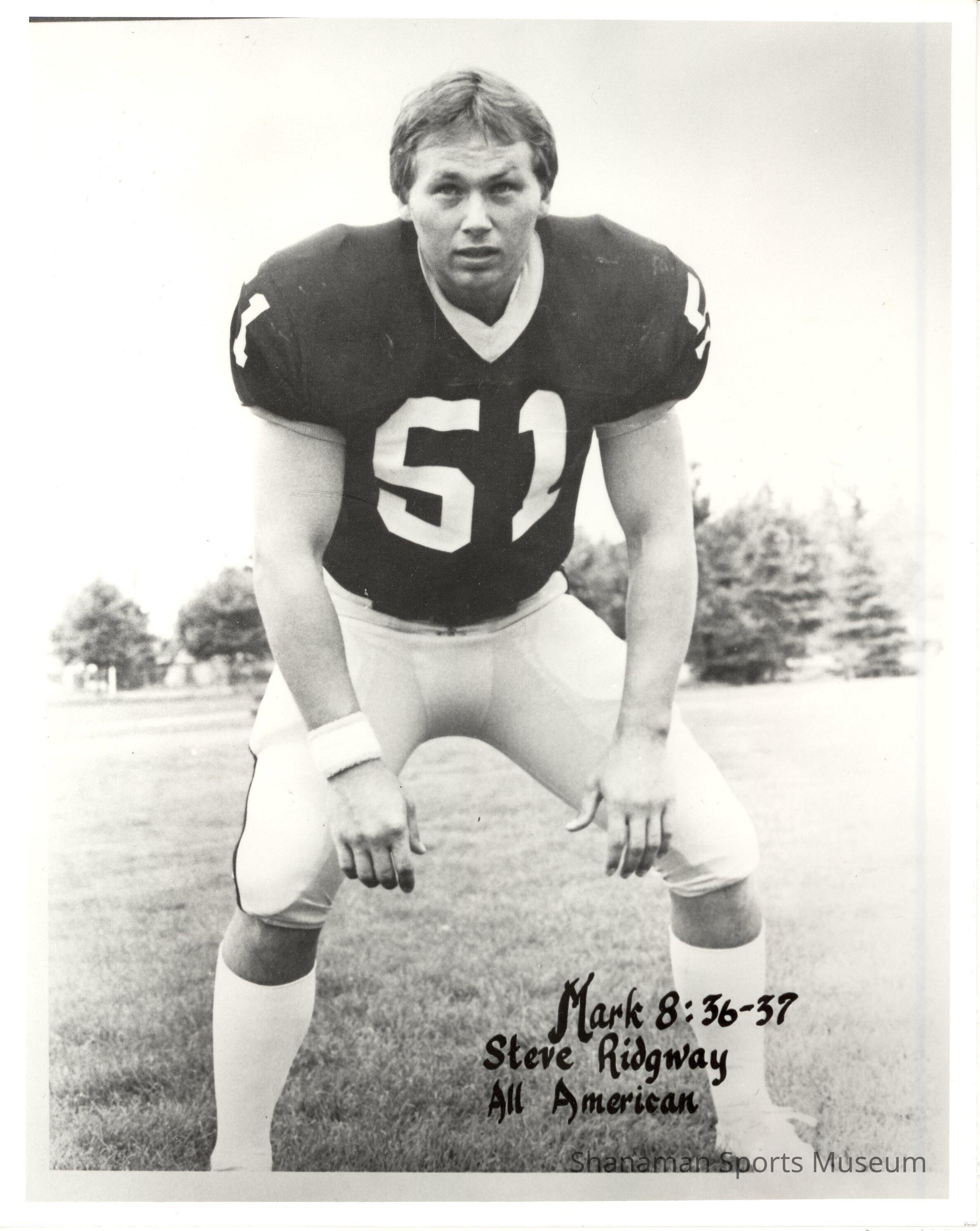 A two-time PLU football team captain, Ridgway compiled impressive career statistics. He is credited with 592 tackles (primary and assists), three interceptions, 21 pass break ups, five fumble recoveries, and most amazingly for a defensive player, four touchdowns. Several of those are still believed to be Pacific Lutheran records.Lexicon