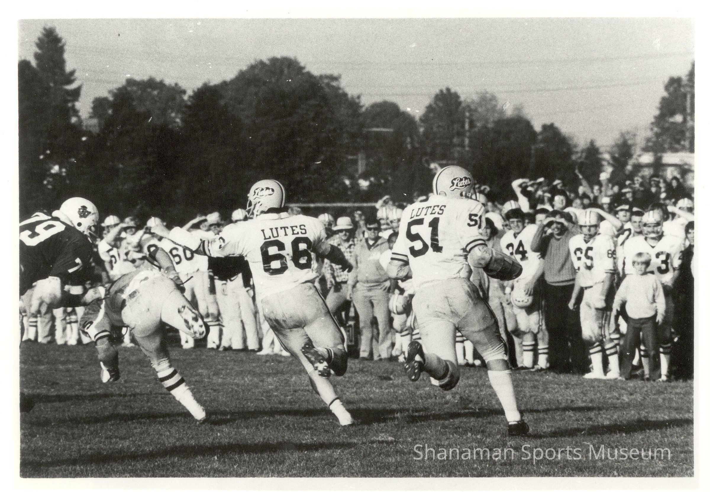 Steve Ridgeway, #51, returns a turnover for Pacific Lutheran University in a game. Steve Ridgway earned numerous honors while patrolling the defense from 1973-76 as a linebacker for Coach Frosty Westering's Lutes. Ridgeway, who was called a “fierce competitor” by his coach Frosty Westering, was the first PLU football player to earn NAIA District I all-star honors four straight years. Ridgeway also earned NAIA All-American honors three times as a linebacker. In 1975 and 1976, he was honorable mention All-American. In 1977 as a senior, he was second-team All-American. He finished his career with the Lutes with 592 tackles, three interceptions, 21 pass break ups, five fumble recoveries and four touchdowns. Ridgeway was named to the PLU Athletic Hall of Fame and the Tacoma Pierce County Athletic Hall of Fame.Lexicon
