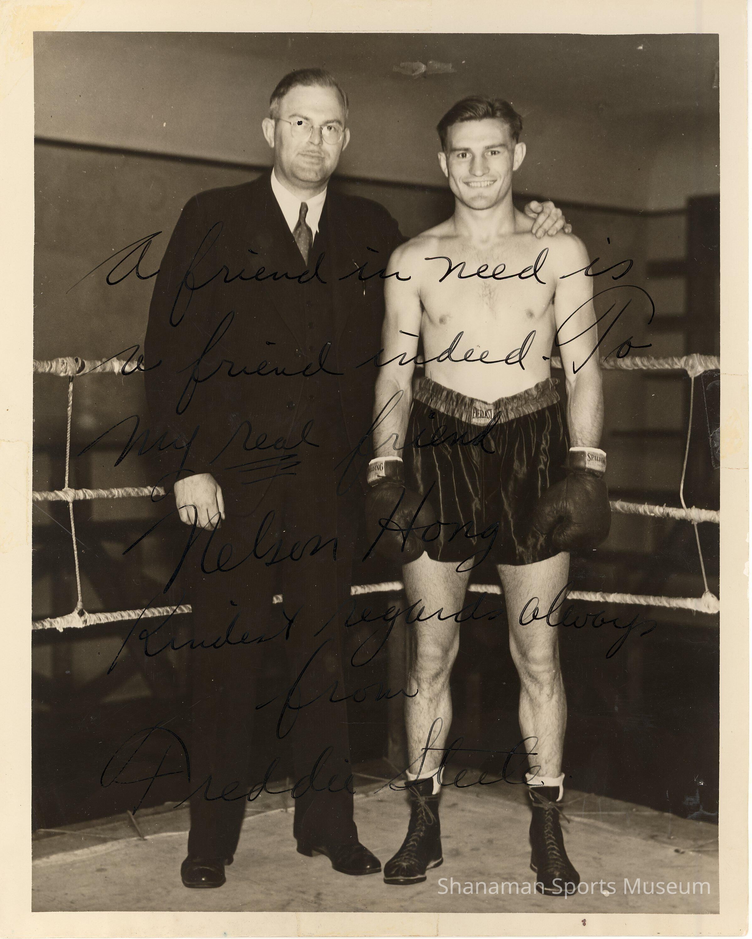 B/w Photograph of Nelson Hong (L) and boxer Freddie Steele (R) standing in a boxing ring. "A friend in need is a friend indeed. To a real friend, Nelson Hong. Freddie Steele" written over the photograph.