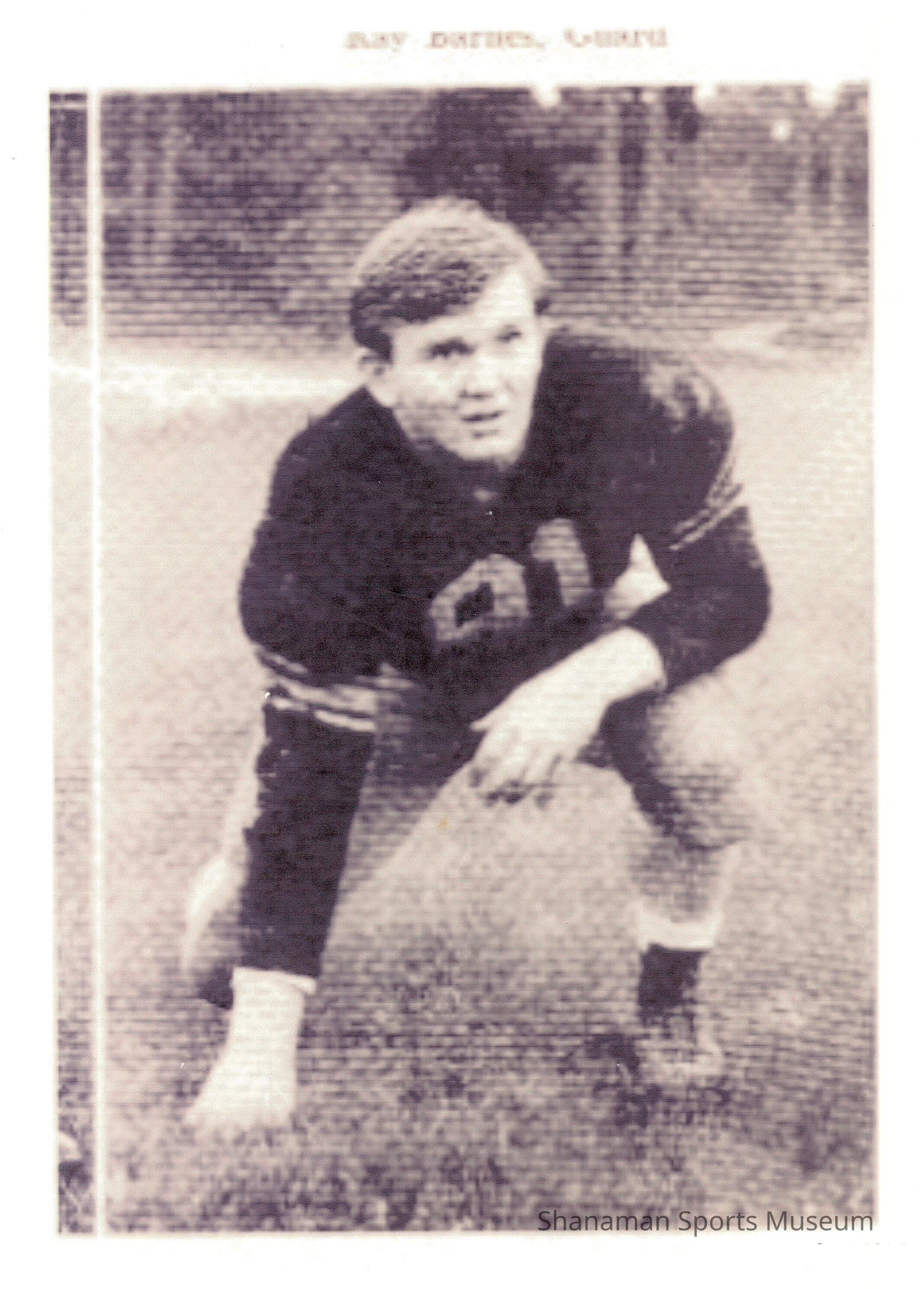 b/w re-print of a photograph of Raymond Barnes while playing football for Pacific Lutheran College, c. 1951.Relationships