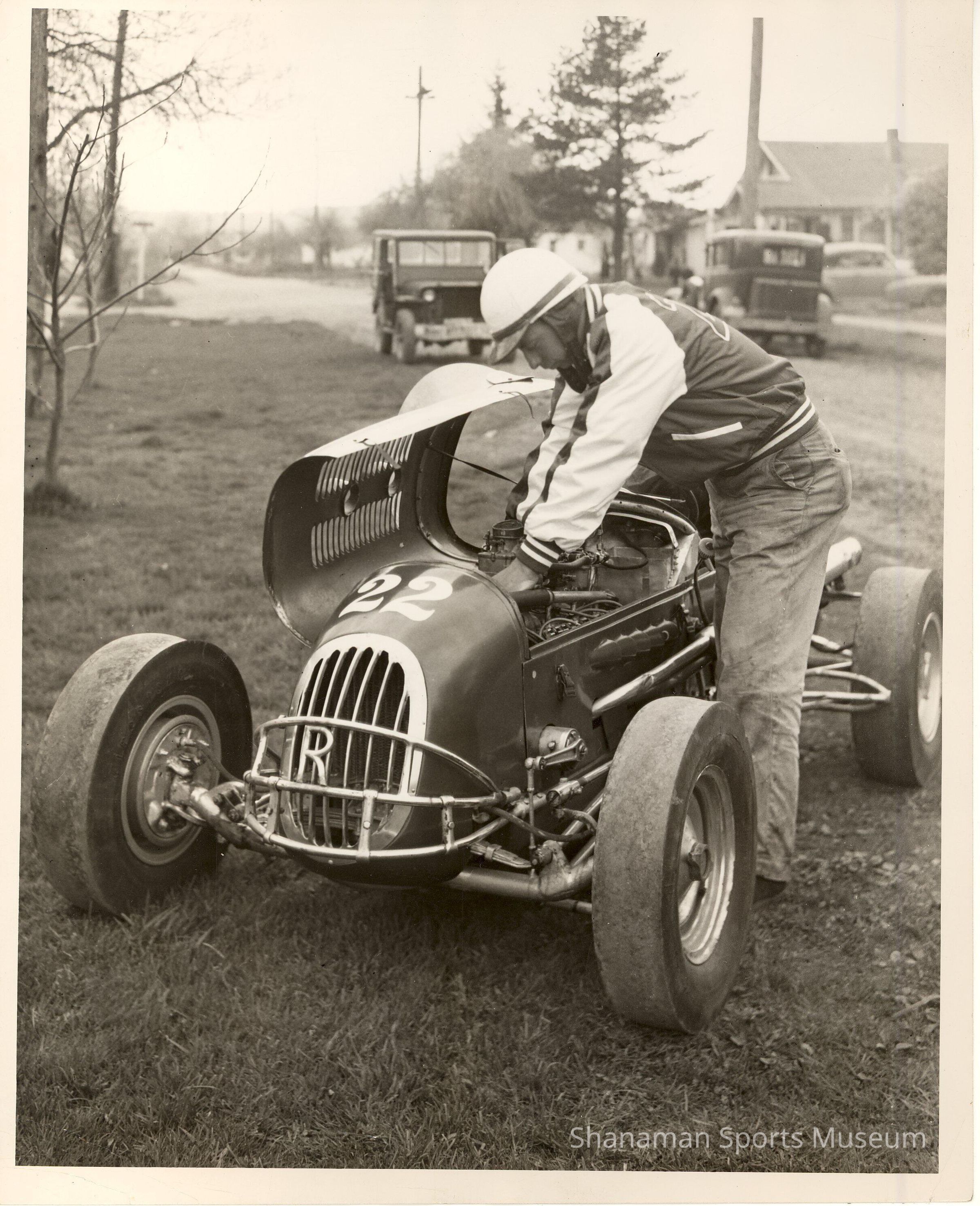 In this black-and-white photo, Mel Maughey fixes the engine of his midget race car, No. 22. Maughey had five midget race cars and frequently entered races in Tacoma and across the country. Back in the late 1940s and 1950s, midget race car races were held at Tacoma's Athletic Park on 14th and South Sprague.Lexicon