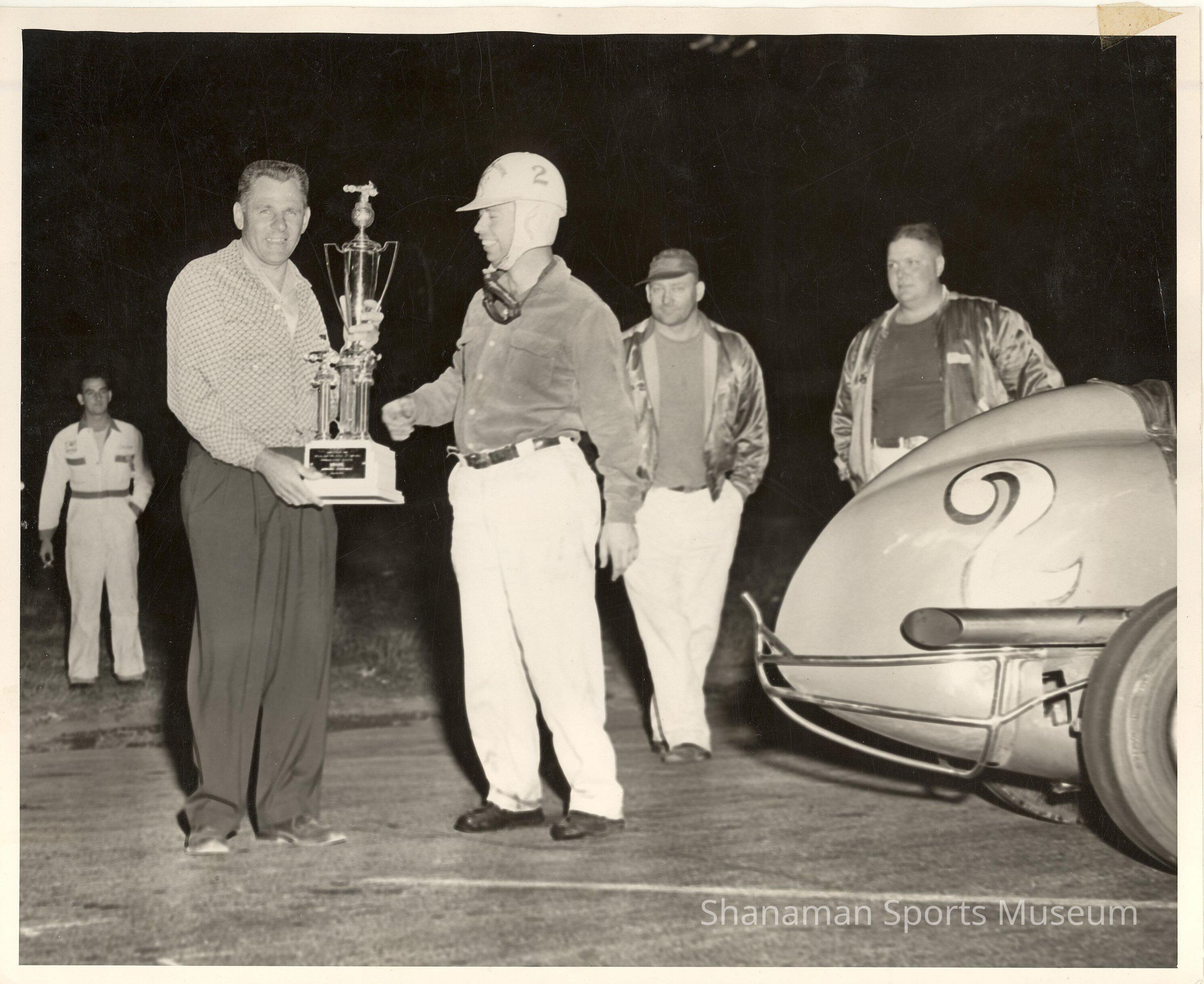 Mel Maughey, wearing his helmet and racing clothes, is presented with a trophy after winning a midget car race in Tacoma. The first midget car race happened in 1933 in Los Angeles and by the late 1940s Tacoma had its own track and was holding races. In 1941, car racing returned to Tacoma when a wooden, 2-mile track was built in Tacoma. In the 1920s, another Tacoma track was considered to be the second best race track in the country, trailing only the Indianapolis 500. An arson fire destroyed the grandstands, which were rebuilt but it eventually closed.Lexicon