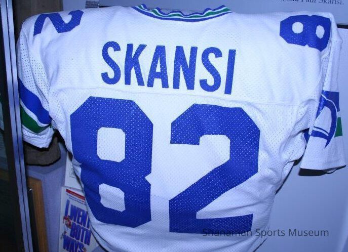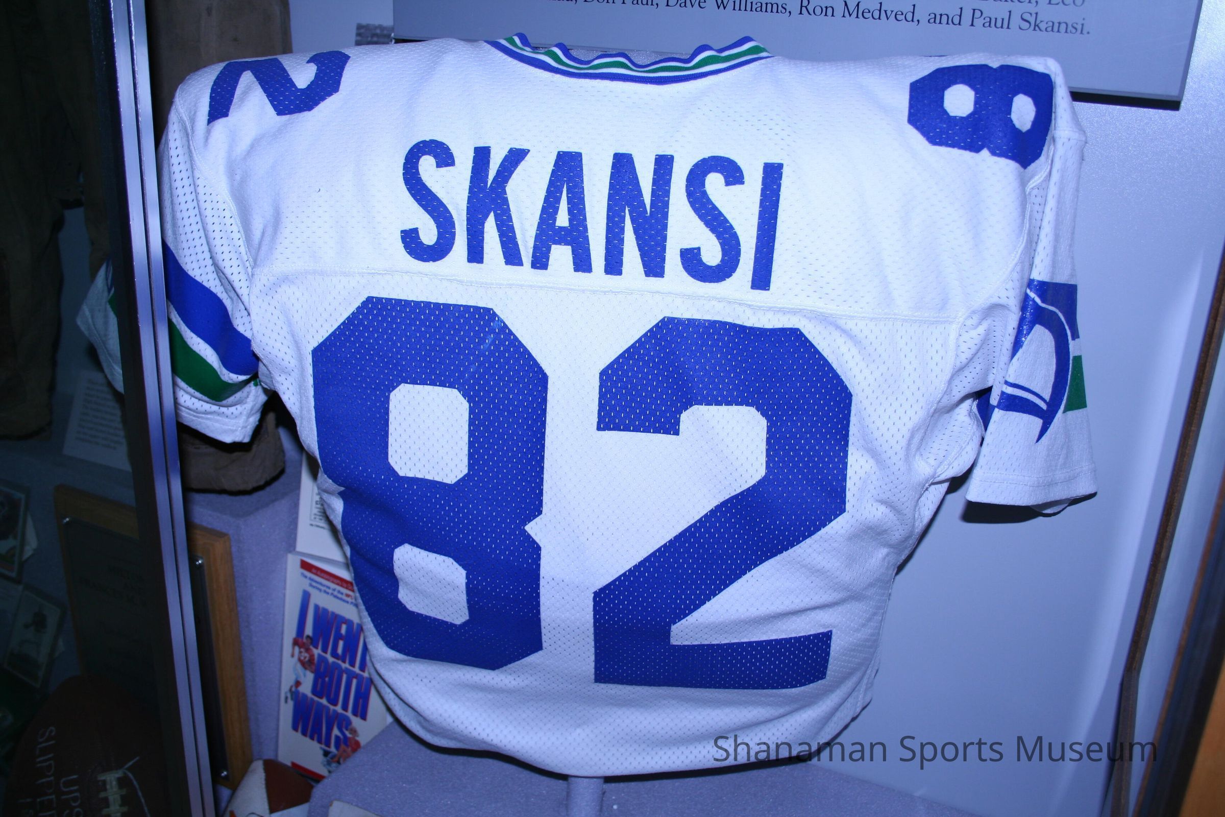 This Jersey was worn by former Punt returner and Receiver Paul Skansi. Skansi was drafted in the 5th round of the 1983 NFL draft, and played professional football for ten years, one with the Pittsburgh Steelers, eight for the Seattle Seahawks and one season in the Canadian football league as a member of the Ottawa Rough Riders. Skansi was a standout athlete at Peninsula high school in Gig Harbor, then continued his career at the University of Washington where he set the record for passes received throughout his time on campus. His most successful NFL season was in 1989, when he caught 39 passes for 488 yards and 5 touchdowns. Skansi tasted the Postseason three times in the NFL, once with Pittsburgh and twice as a Seahawk. The jersey itself dates back to 1991, Skansi’s last year in Seattle. It is an away jersey as can be told by the primarily white color, with blue and green stripes on the short sleeves.Lexicon