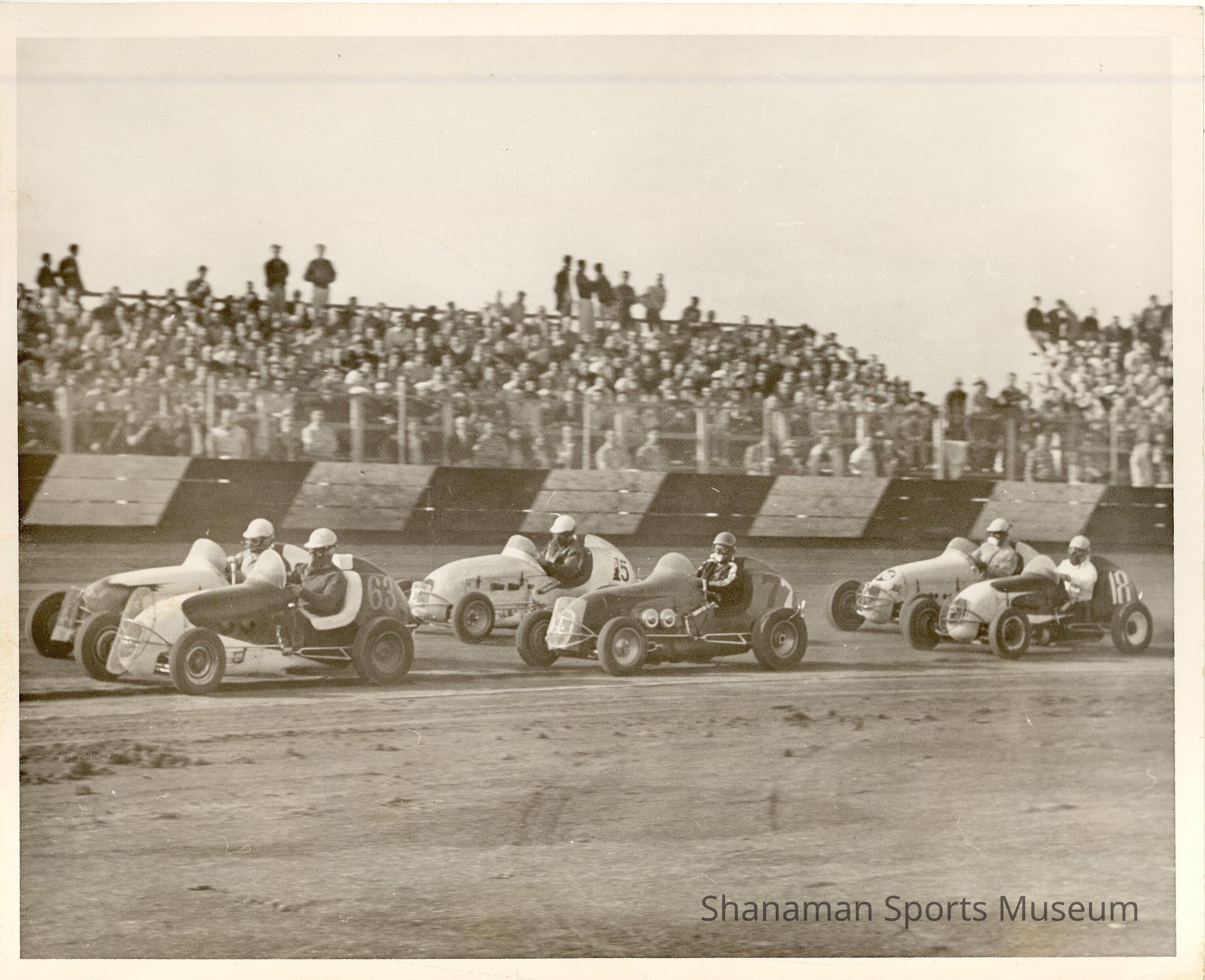 Driving in car No. 63, Mel Maughey tries to hang on to the lead as he races along in his midget race car on an oval track at Tacoma's Athletic Park on 14th and South Sprague. Back in the 1950s, the Tacoma oval track was popular and well attended by fans as this photo shows. In addition to the Tacoma race track on 14th and South Sprague, there were midget car races at Seattle Speed Bowl, which opened in 1936 and hosted races and closed during World War II, never to open again.Lexicon