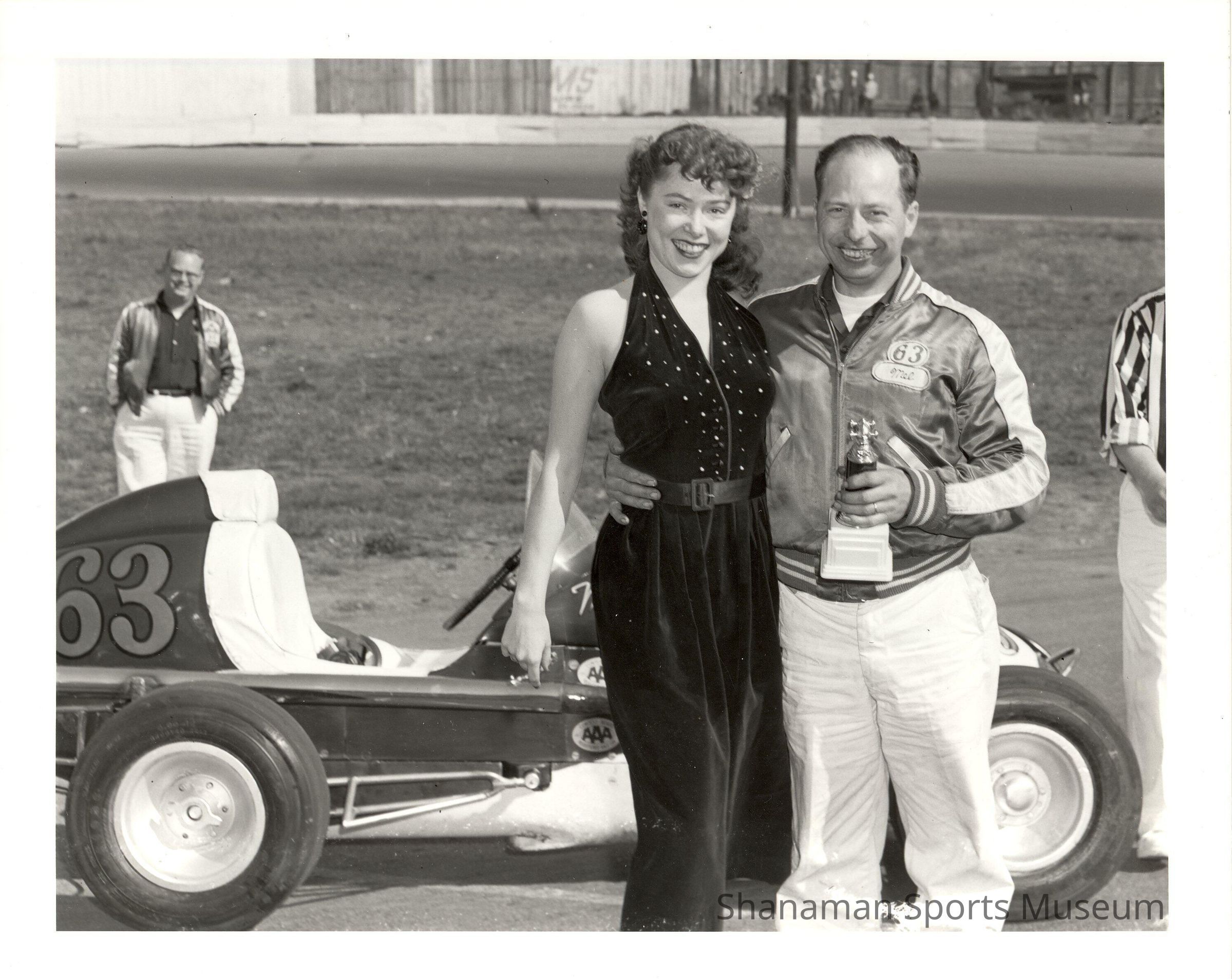 Standing by a woman, Mel Maughey holds a trophy for winning a midget auto race. Maughey's car is in the background. An avid racer, Maughey had five or six midget race cars. It was a popular sport in Tacoma back in the late 1940s and 1950s as there was an oval race track at the Tacoma Athletic Club on 14th and South Sprague.Lexicon