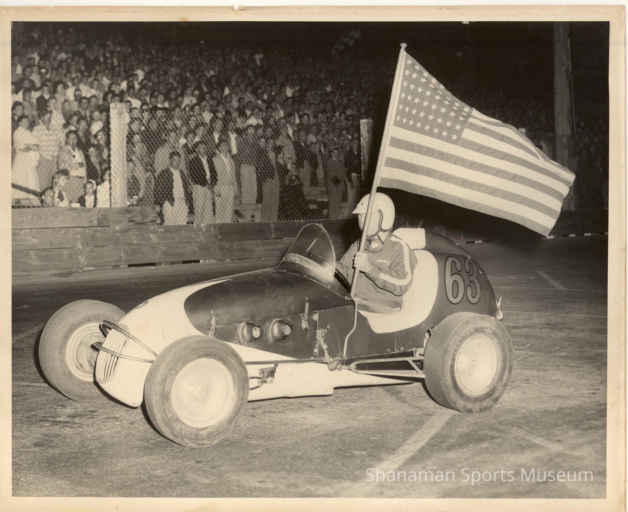 With a large crowd watching, Mel Maughey holds a U. S. flag as he drives his midget race car, ready to begin another race. He was driving in his No. 63 midget race car. It was one of six race cars he owned. He was an avid racer and a popular face at racing events. The sport is still going strong. There is a Washington Midget Racing Association that began its 69th season of racing in 2018. Midget racing has a rich history in Tacoma. Midget car racing began in California in 1934 and spread to Tacoma by the late 1940s.Lexicon