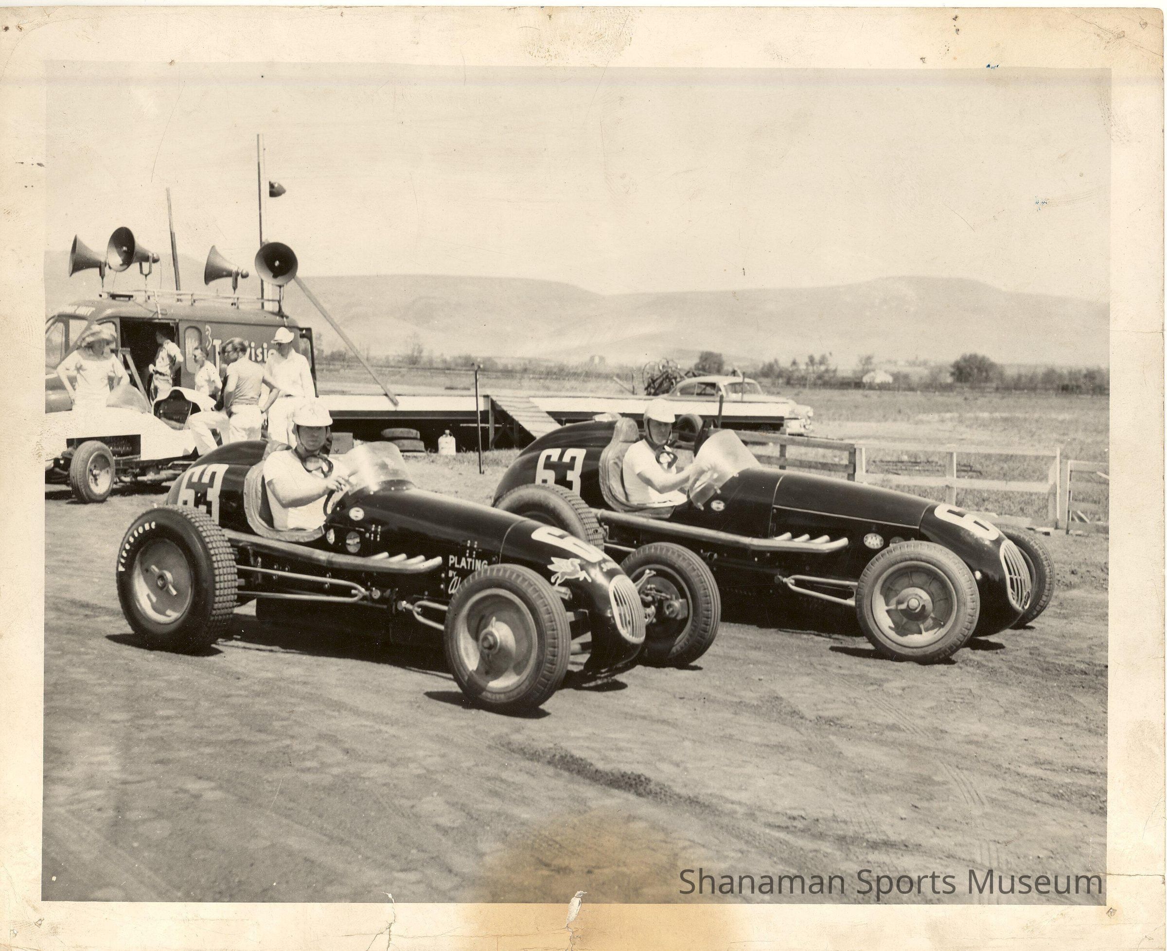 Mel Maughey gets his picture taken sitting in his midget racing car (on the left). Midget car racing was a popular sport in the Tacoma area for a long time. In 1956, Dick Boness built a paved, quarter-mile oval track, the Spanaway Speedway. The track was in continuous use for almost 50 years.Lexicon
