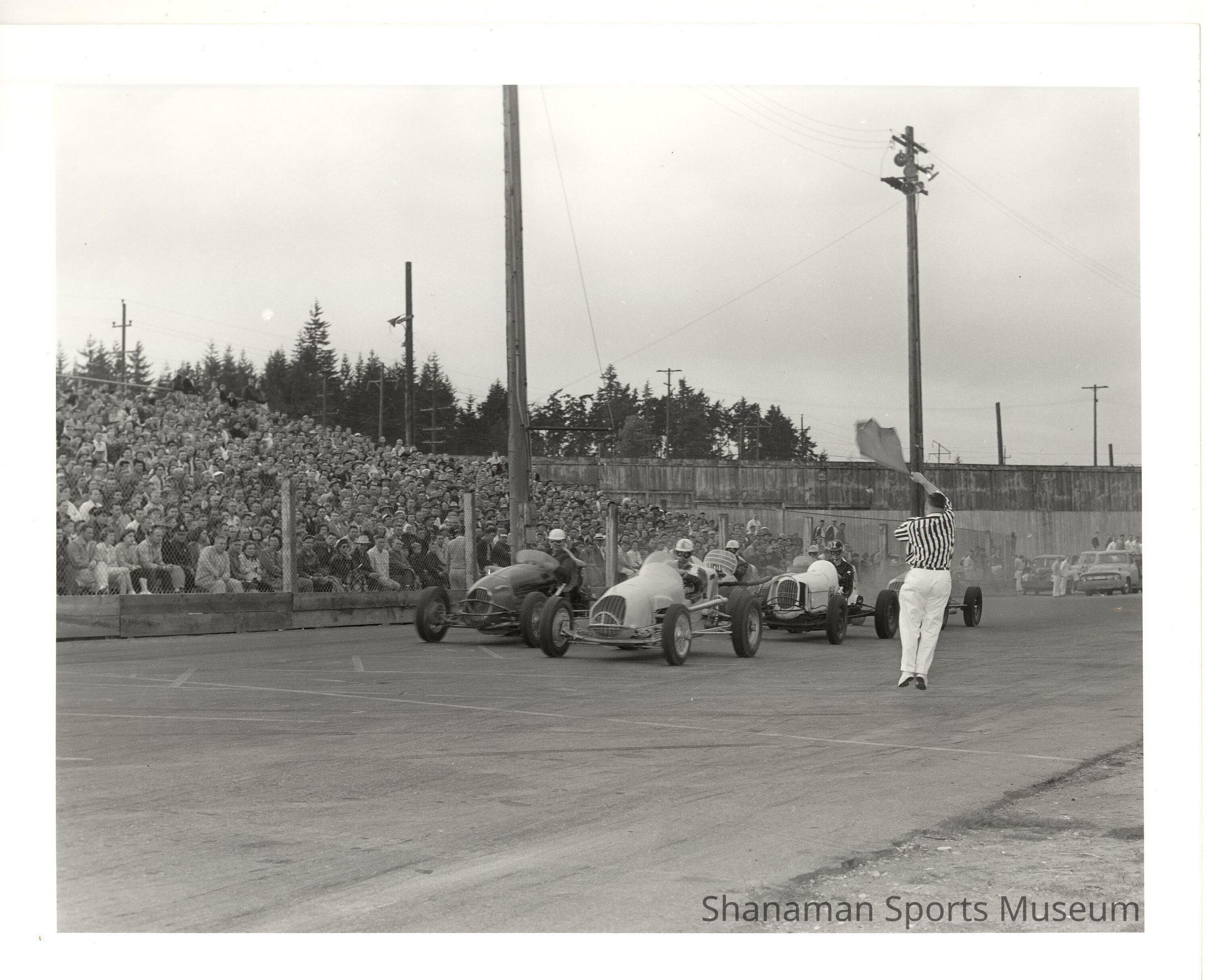 With the grandstands packed with fans, an official waves a checkered flat to start a midget auto race in Tacoma. The oval, quarter-mile track was one of the most popular tracks in the country. The NASCAR and USAC (which is now IndyCar) had sanctioned races at the track for decades. Today a housing development is built on the site and all that remains of the Spanaway Speedway built by Dick Boness in 1956 are memories.Lexicon