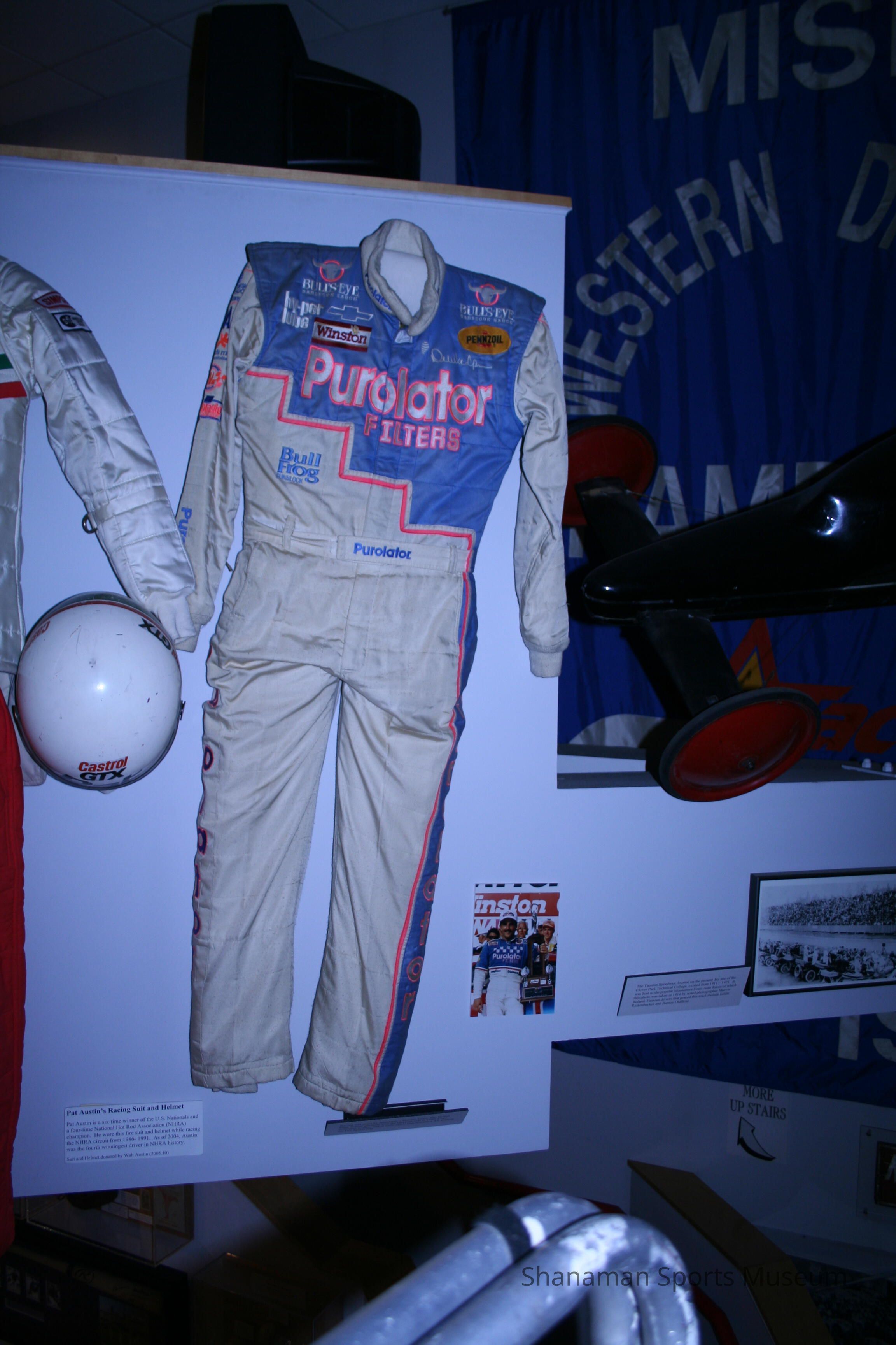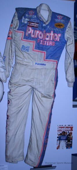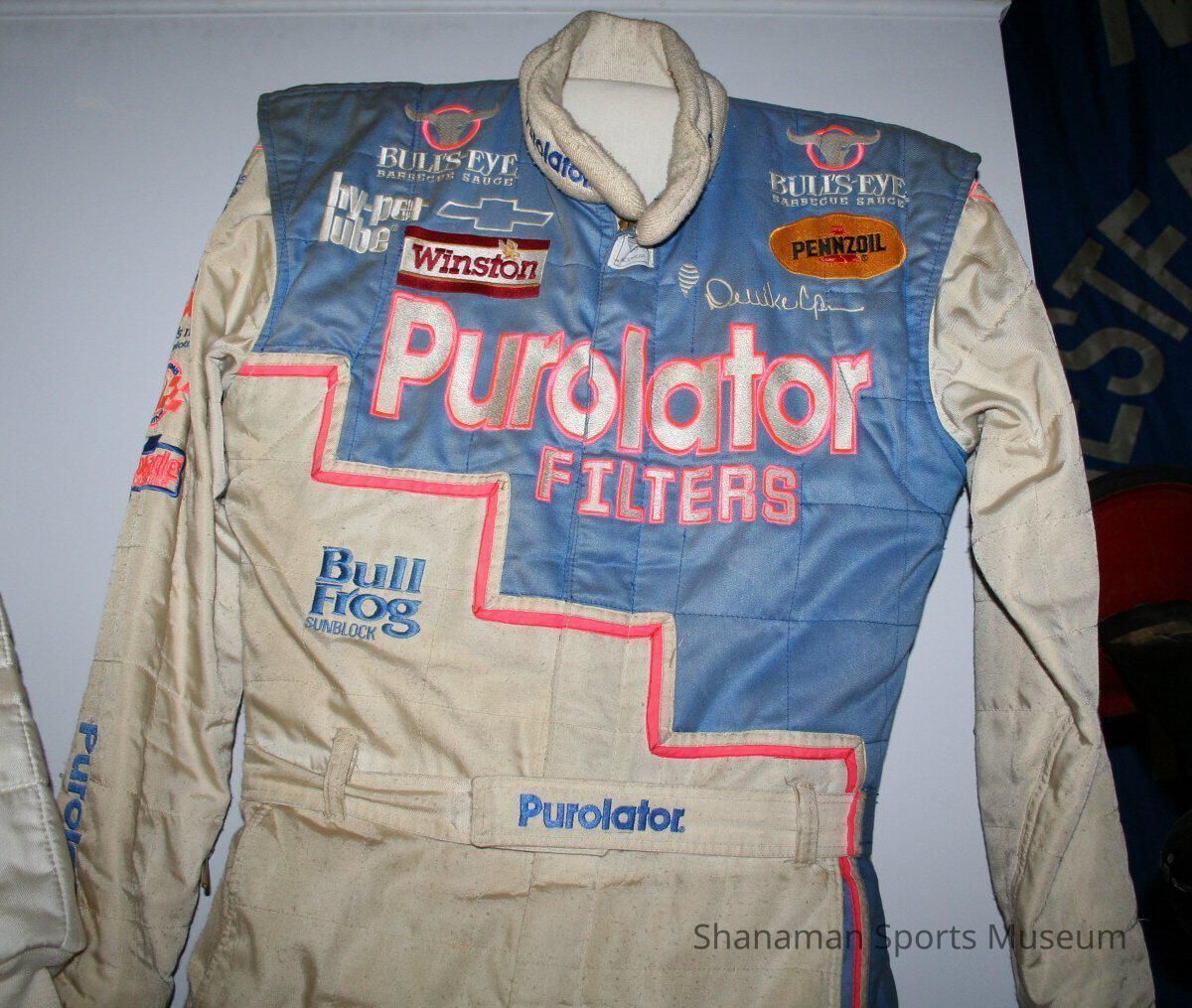 Racing suit worn by Derrike Cope - Bethel H.S. grad - he won the Datona 500; Silver in collor with blue design across chest; PurolatorLexicon