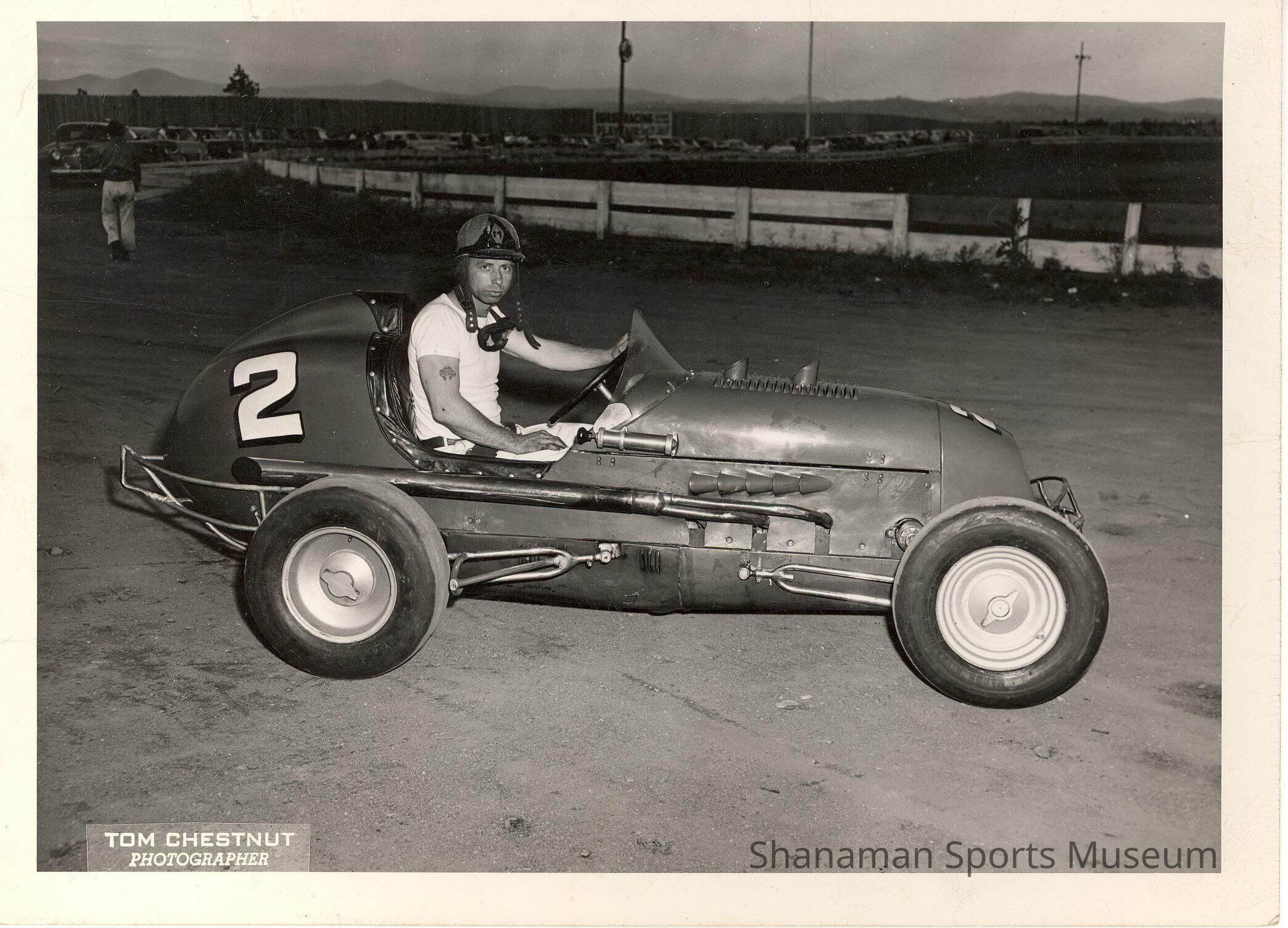 Sitting in his midget race car, Mel Maughey smiles for a picture. He was a regular driver in midget car races. Midget race cars originated in the United States in the 1930s and the cars are very small with a very high power-to-weight ratio. Typically, these race cars have up to 400 horsepower engines and weigh about 900 pounLexicon