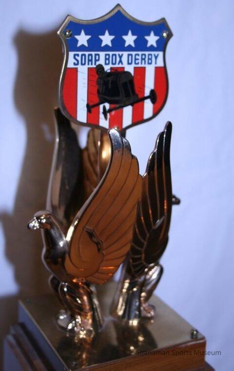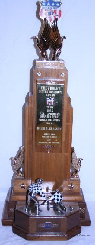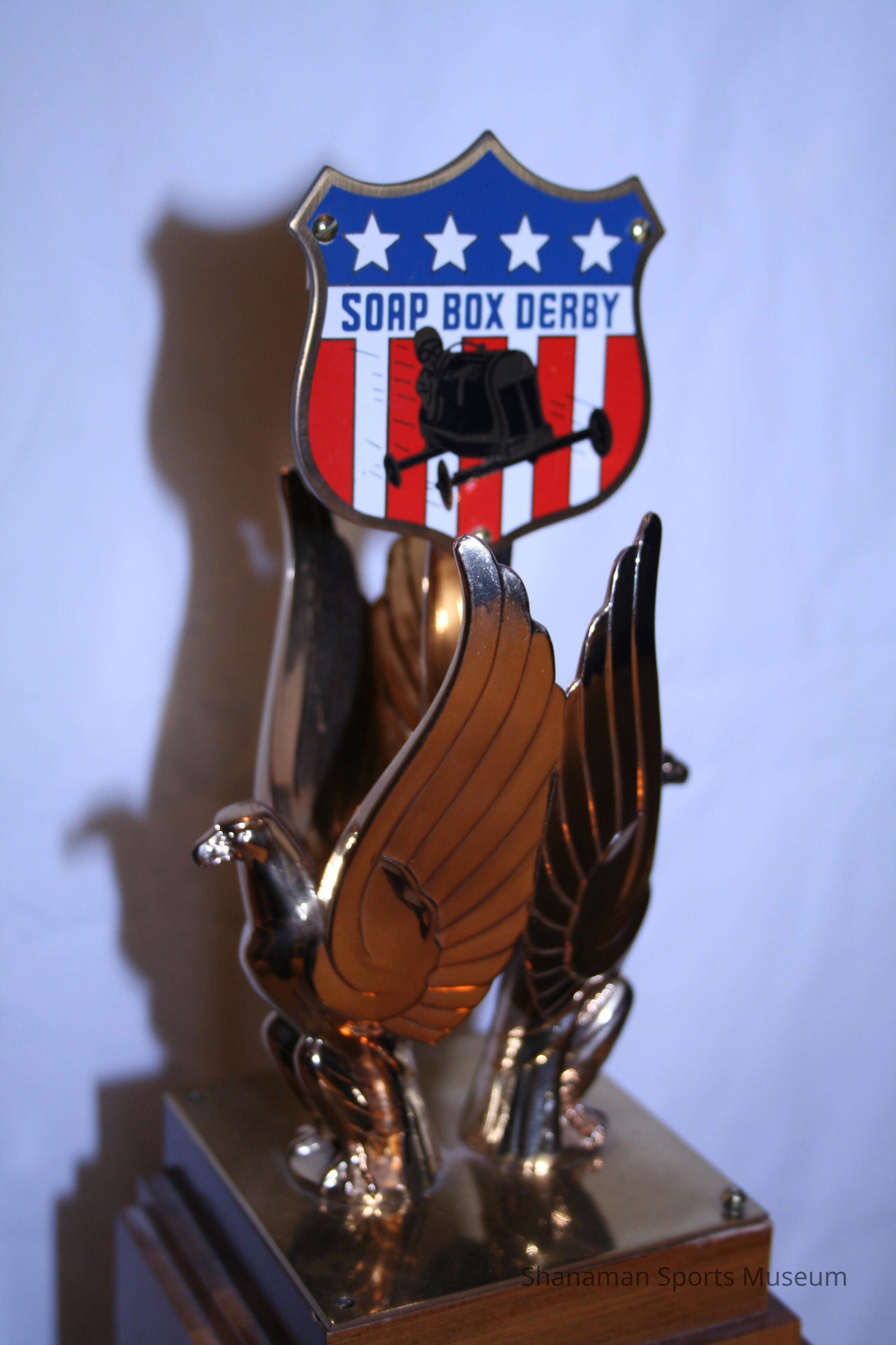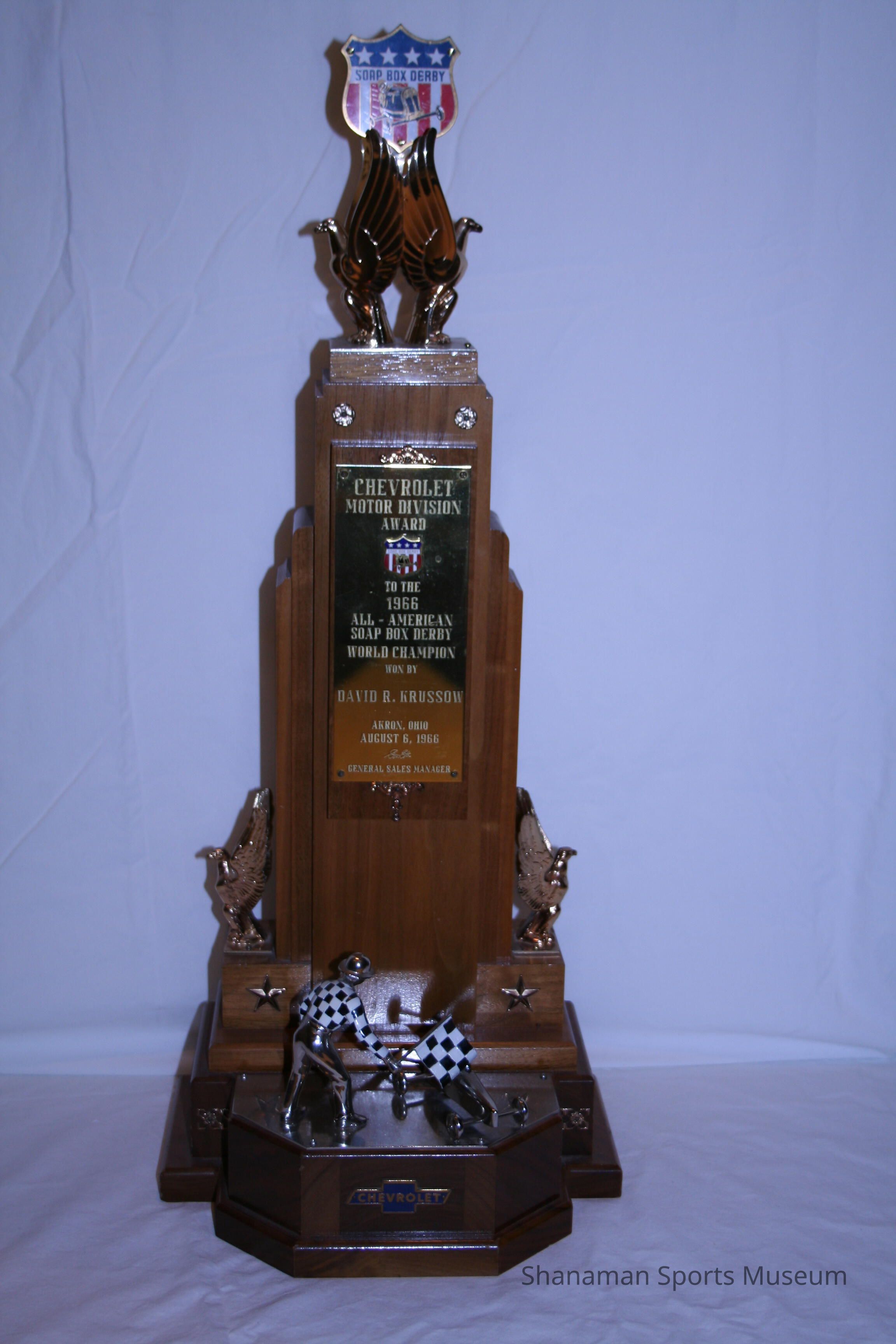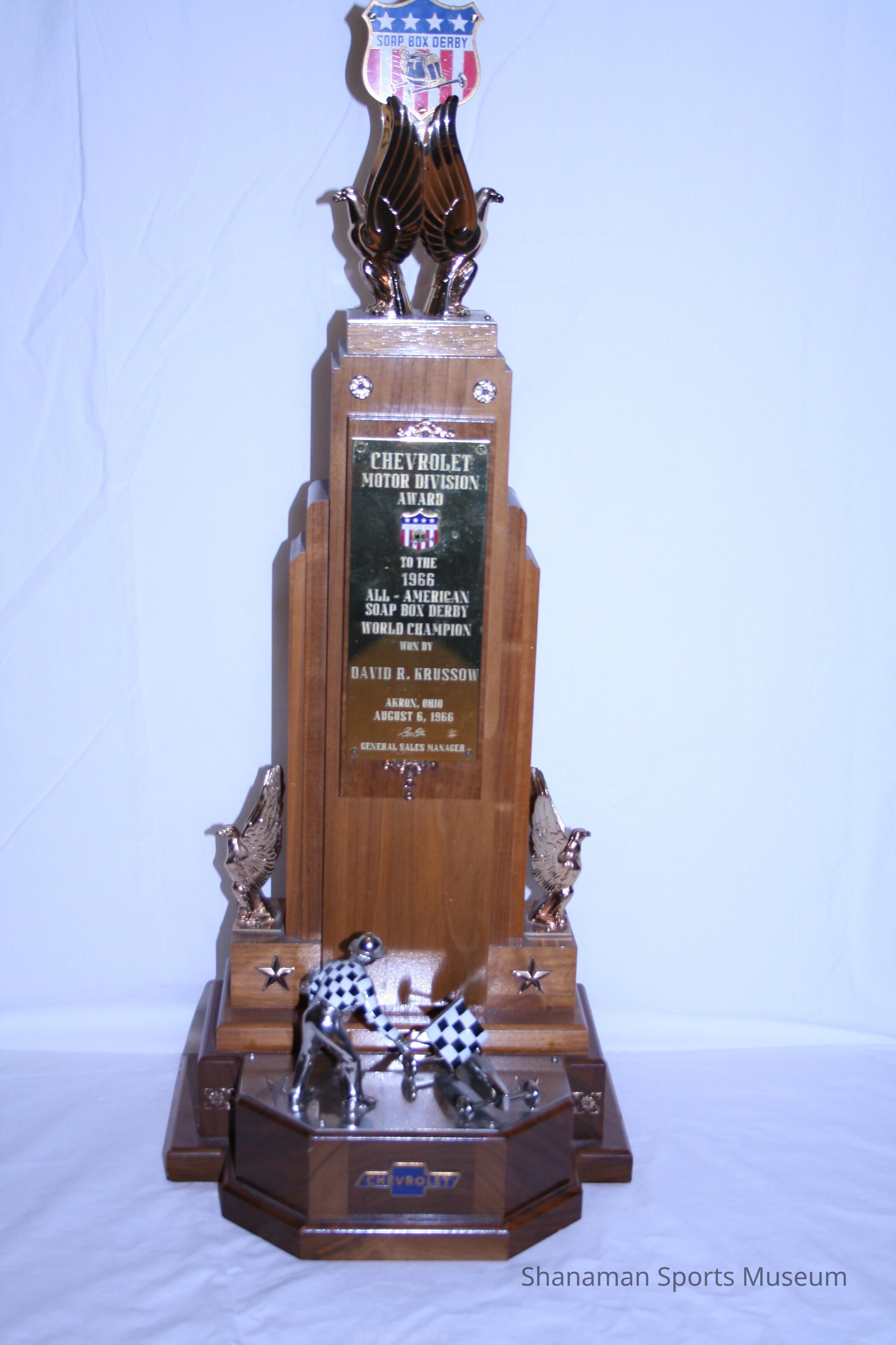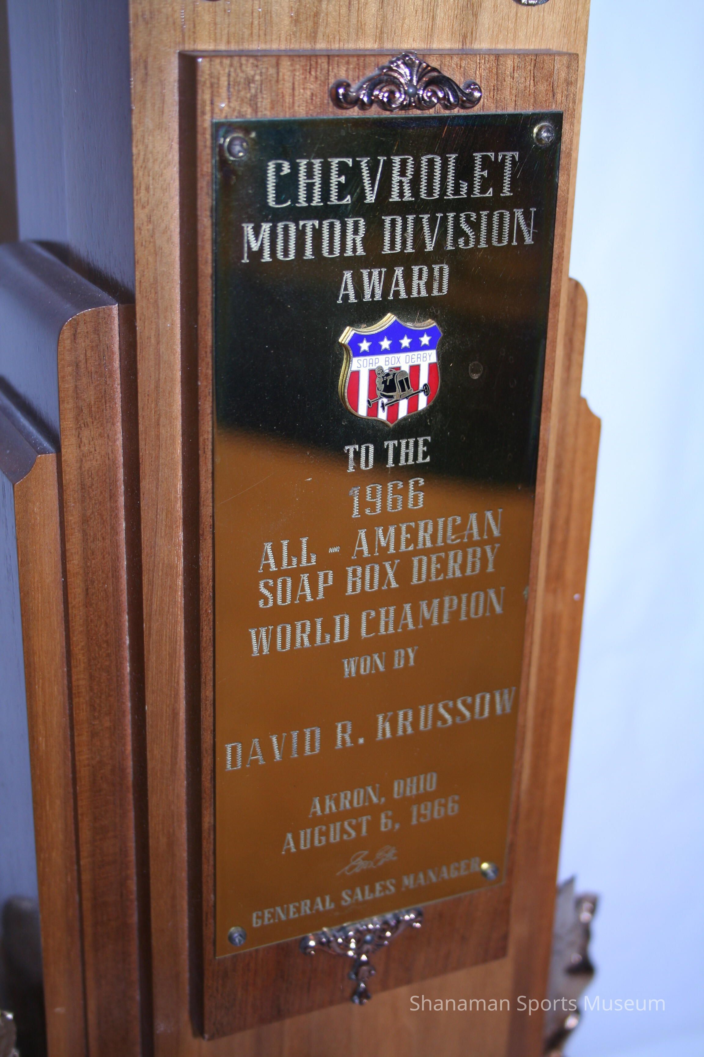 This trophy was given to the winner of the 1966 All-American National Soap Box Derby Champion. That year it was 12-year-old Krussow of Tacoma who won the prestigious race in Akron, Ohio. Krussow earned a $7,500 college scholarship and this plaque commemorating the event. Soap box derby racing began in 1933 and was a popular activity for youth during the decades to come. The first official All-American Soap Box Derby in Dayton, Ohio, was in 1934. The national race ran continuously until a four-year hiatus during World War II and then resumed in 1946 and has been held every year since. Tacoma held its first soap box derby in 1940.