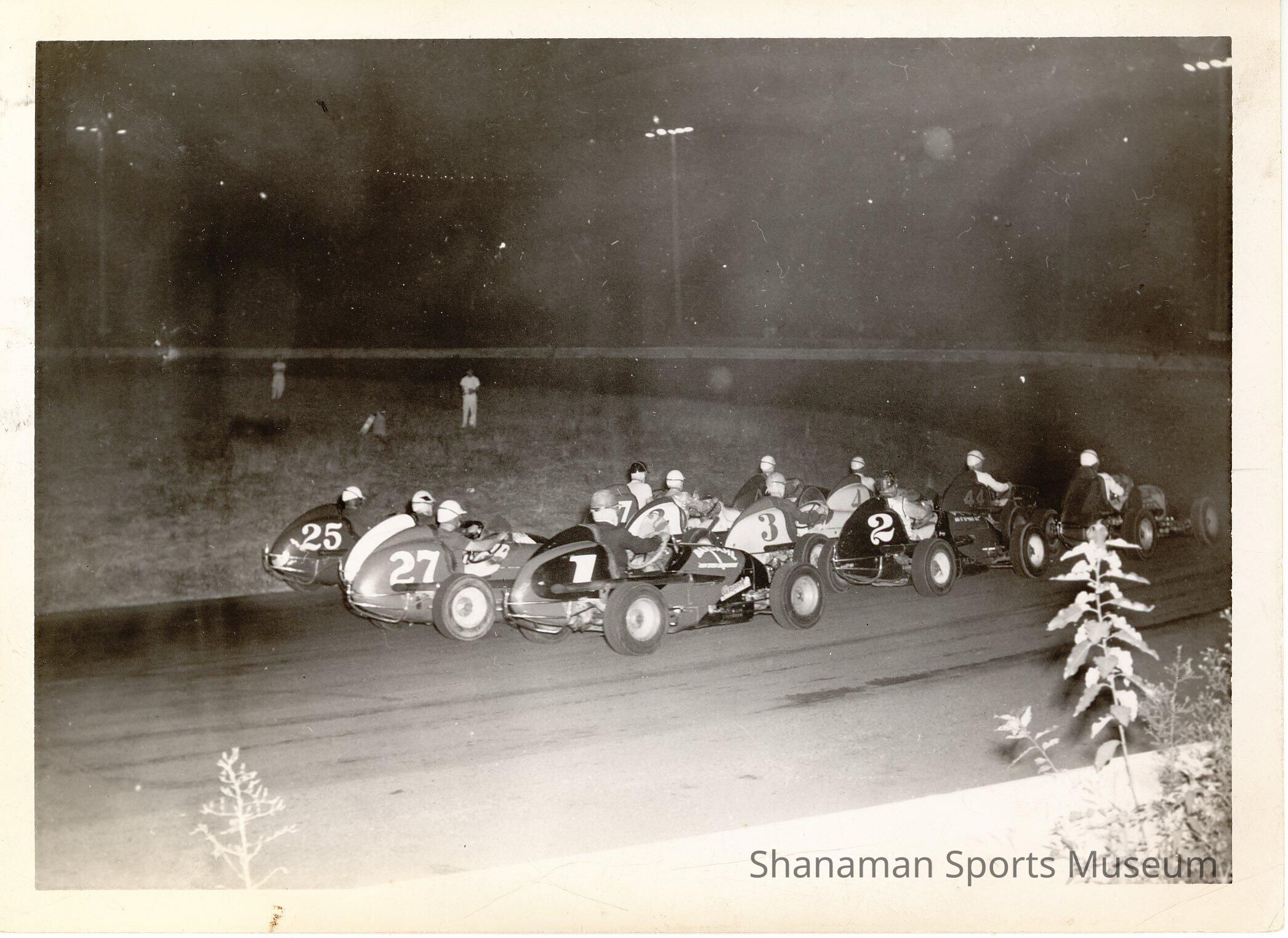 In his No. 27 midget race car, Mel Maughey speeds along with 10 other cars entered in the race. Midget car races were a popular event in the 1950s and 1960s. In 1956, a paved, quarter-mile track on South Sprague Street was built in Tacoma and was a popular site until the mid 1990s. The track was torn down and houses were built in its place. From 1914 to the early 1920s, the Tacoma Speedway, a 2-mile wooden board race track, operated and was renowned nationally. It was considered to be second in the country in race tracks only to the Indianapolis Motor Speedway.Lexicon