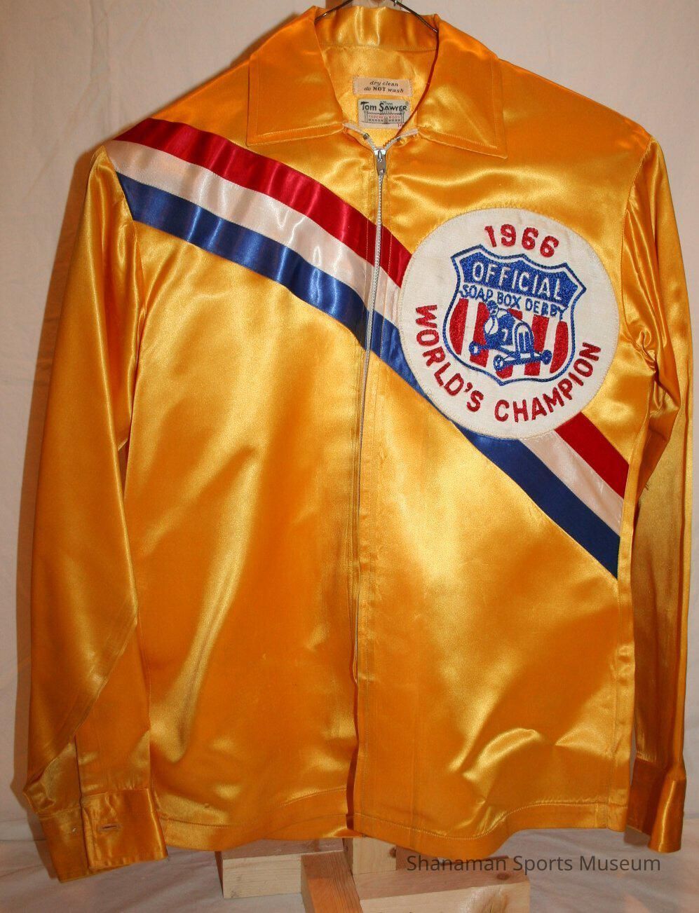 Tacoma’s David Krussow earned this gold satin jacket for winning the 1966 National All-American Soap Box Derby in 1966. Krussow won the prestigious race in Akron, Ohio, when he was 12. Krussow earned a $7,500 college scholarship and this plaque commemorating the event. Soap box derby racing began in 1933 and was a popular activity for youth during the decades to come. The first official All-American Soap Box Derby in Dayton, Ohio, was in 1934. The national race ran continuously until a four-year hiatus during World War II and then resumed in 1946 and has been held every year since. Tacoma held its first soap box derby in 1940.