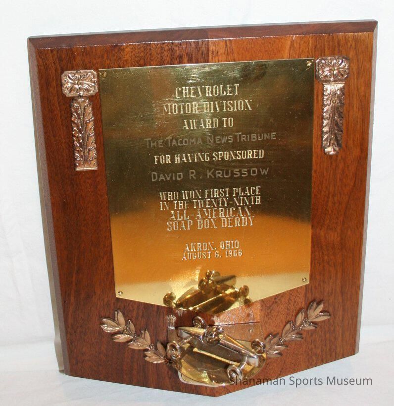 David Krussow was presented this plaque commemorating The Tacoma News Tribune for sponsoring Krussow who won the 29th All-American Soap Box Derby in Akron, Ohio in August 6, 1966. Krussow won the prestigious race when he was 12. Krussow earned a $7,500 college scholarship and this plaque commemorating the event. Soap box derby racing began in 1933 and was a popular activity for youth during the decades to come. The first official All-American Soap Box Derby in Dayton, Ohio, was in 1934. The national race ran continuously until a four-year hiatus during World War II and then resumed in 1946 and has been held every year since. Tacoma held its first soap box derby in 1940.