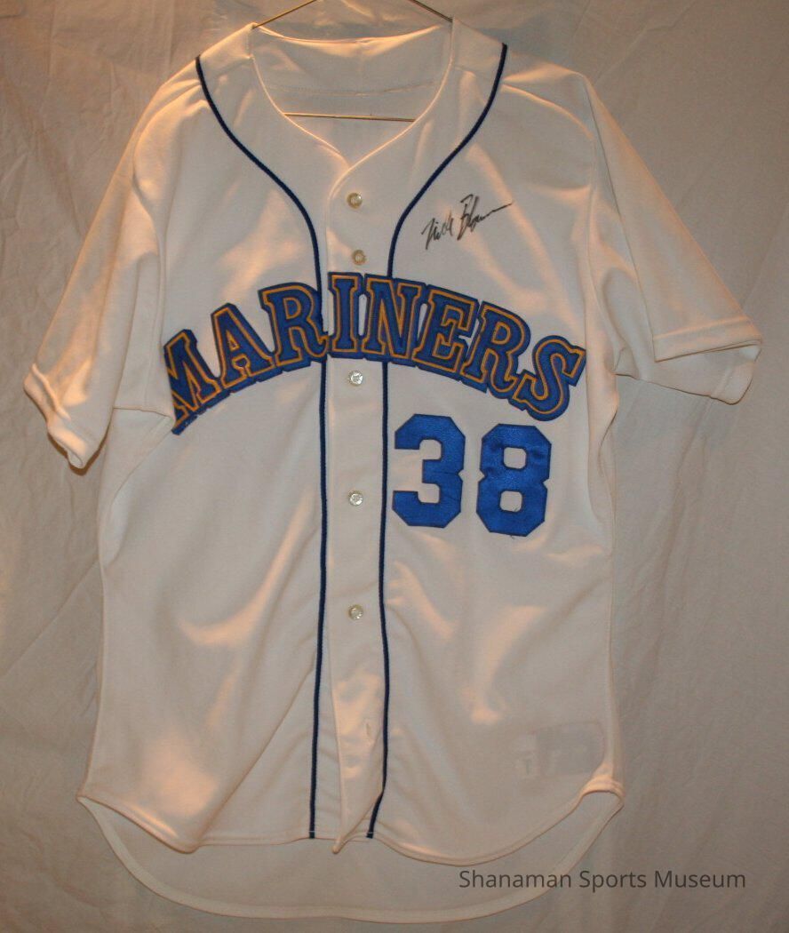 Mike Blowers wore this uniform back in 1993 when he played third baseball for the Seattle Mariners. He played for the Mariners for a divided six years, playing for them 1992-1995, 1997 and 1999. Blowers launched his pro career at Bethel High School in Spanaway and then he went on to be a triple crown winner while playing for the University of Washington. He then went on to play in the major leagues for 11 years, playing for four teams. He played for the New York Yankees from 1989-91, the Los Angeles Dodgers in 1996 and the Oakland Athletics in 1998. In 1995, Blowers had his best season at the plate, collecting 113 hits, 24 doubles, 23 homers and 96 RBI. He blasted three grand slam home runs in one month to tie a major league record. Blowers went on to become a radio and TV commentator of Mariners games and as of 2019 he was in his eighth season of broadcasting.Lexicon