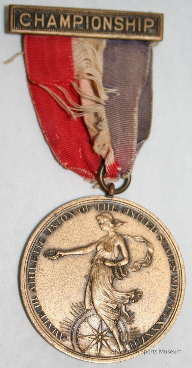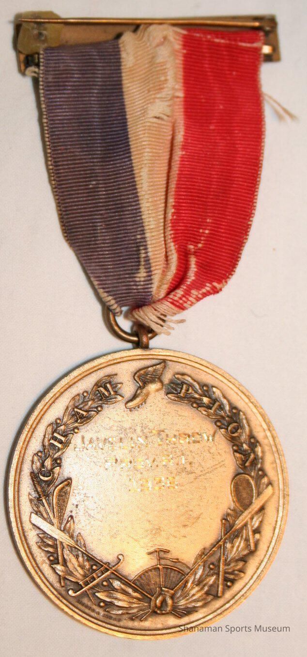 Puyallup native Gertrude Wilhelmsen was awarded this medallion with “Championship” above the cloth portion by placing third in the javelin (119 feet, 3 inches) at the 1936 United States Olympic Trials at Randall’s Island Stadium in New York City.